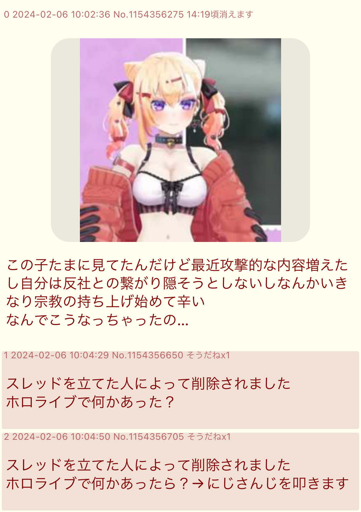 | … | 5626/01/23(金)19:35:51No.1395179760そうだねx8>ホロみたいに捏造で燃やされたりもしなけりゃホロ以外みたいに実況スレのコピペスレも立てられないじゃん |