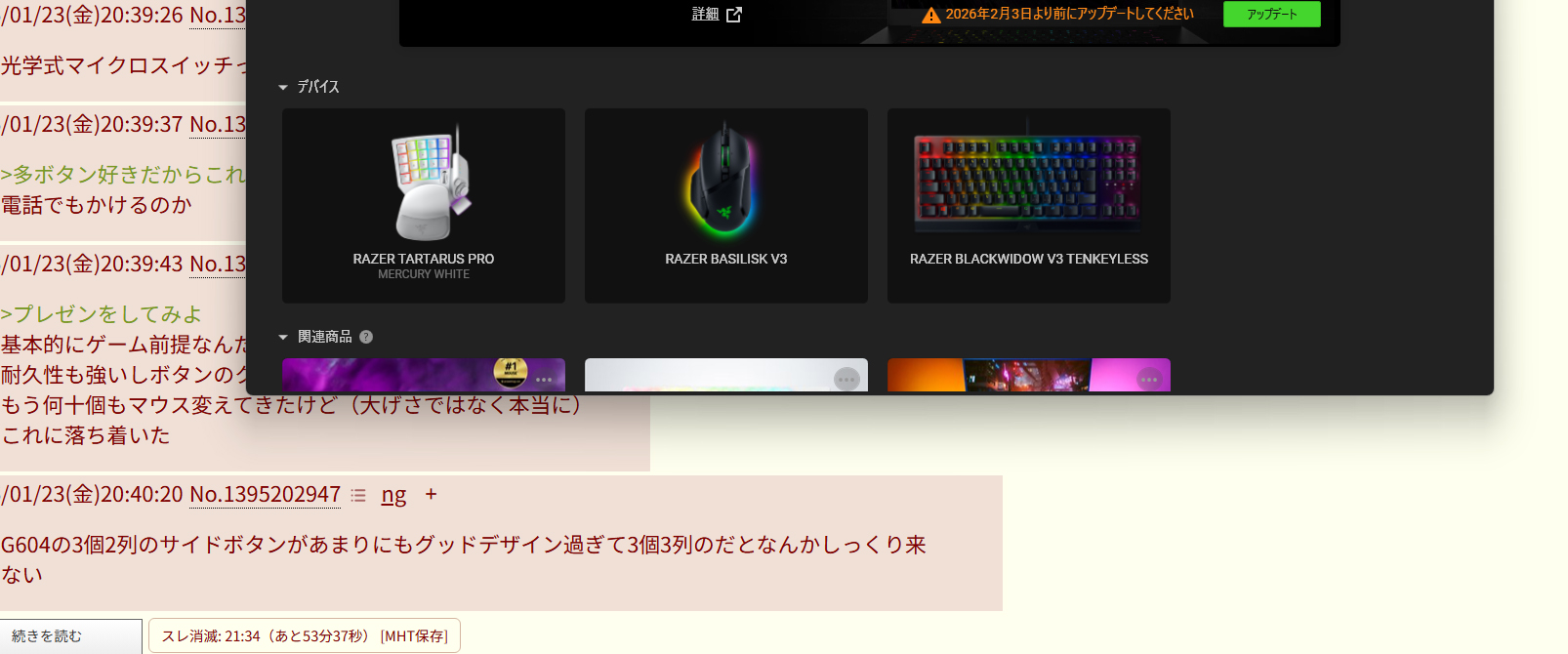 | … | 16026/01/23(金)21:03:45No.1395212826+g502x lightspeedとbasilisk v3 proだったら「」はどっち買う? |