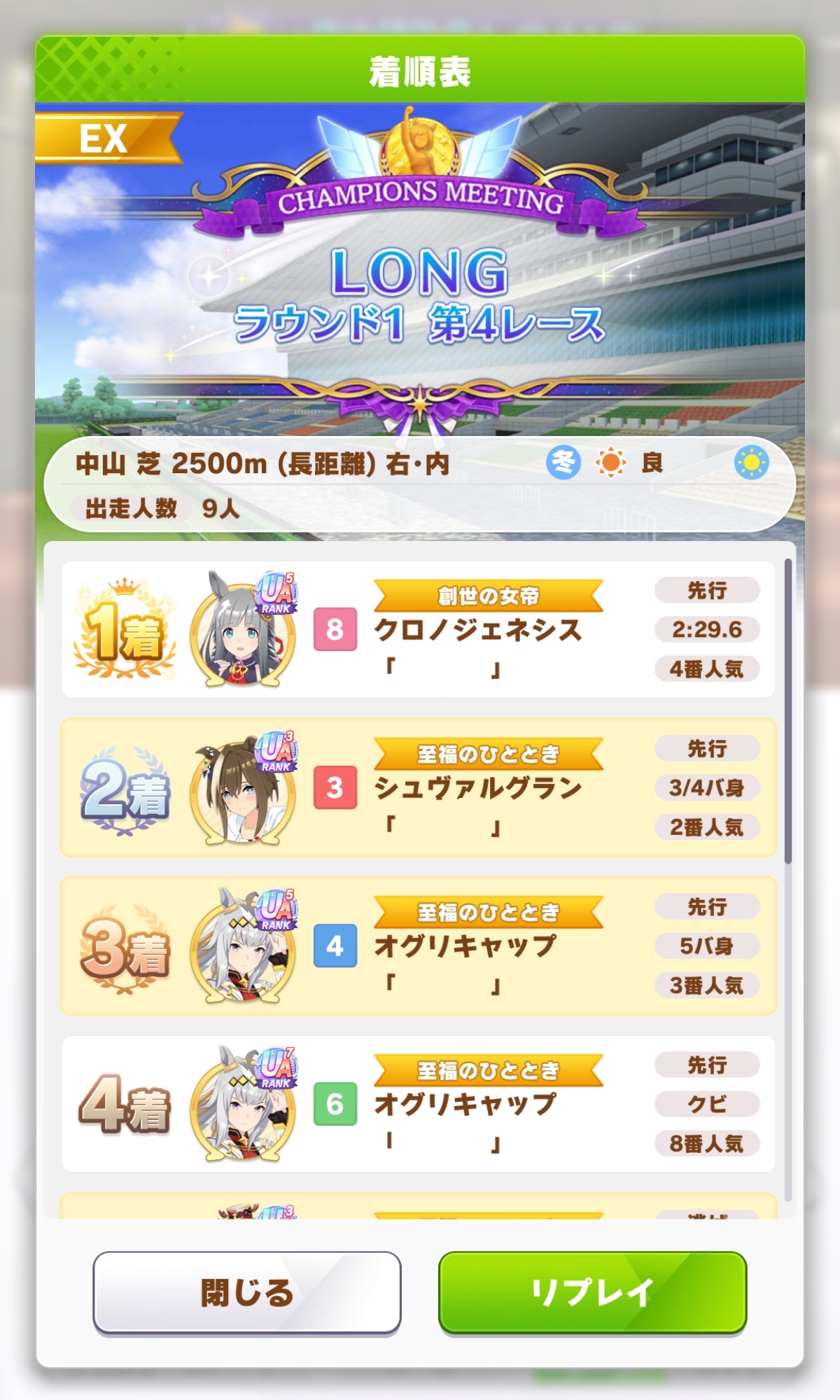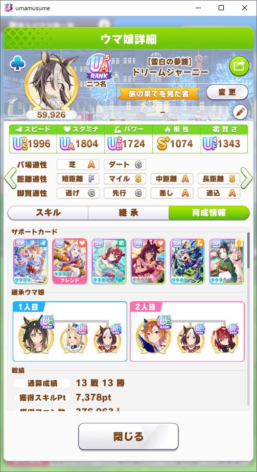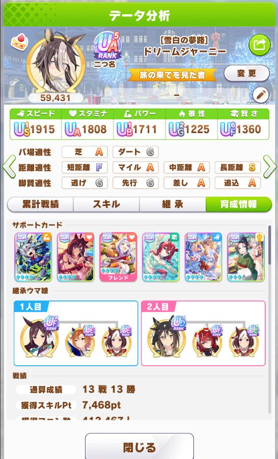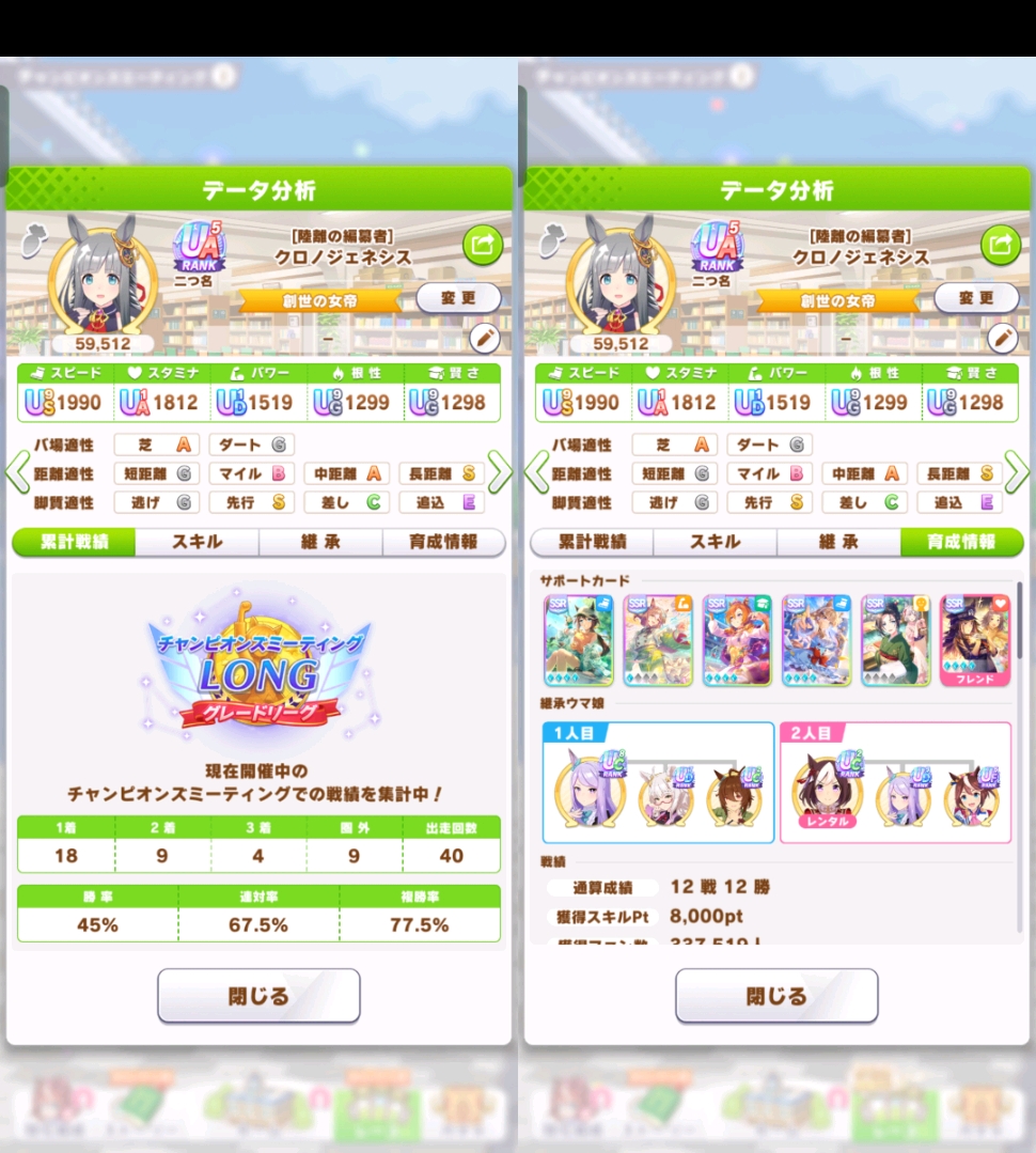 | … | 21226/01/23(金)22:01:30 ID:vWg9SsikNo.1395236783そうだねx1長距離はスピードの差がよく出るのでスピードはカンスト欲しいです |