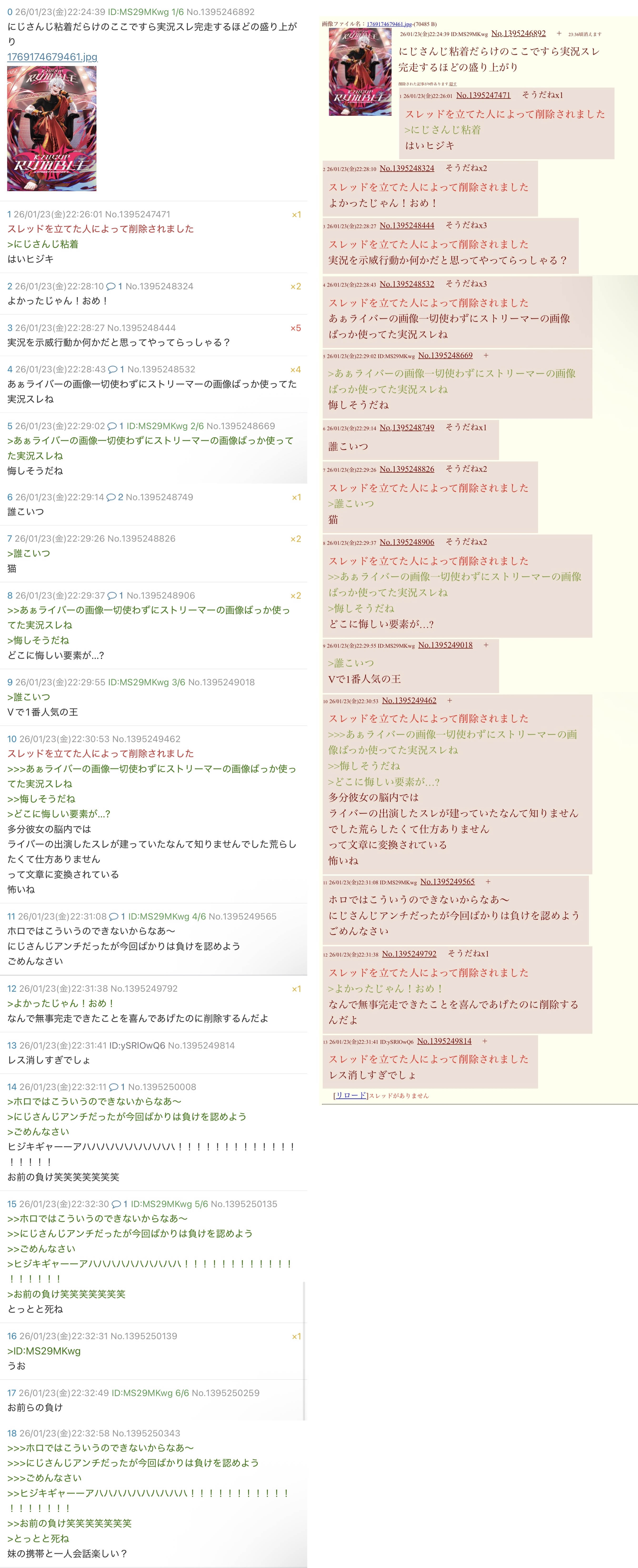 | … | 4026/01/23(金)22:45:45No.1395255252そうだねx8>ID出してままVに粘着して |