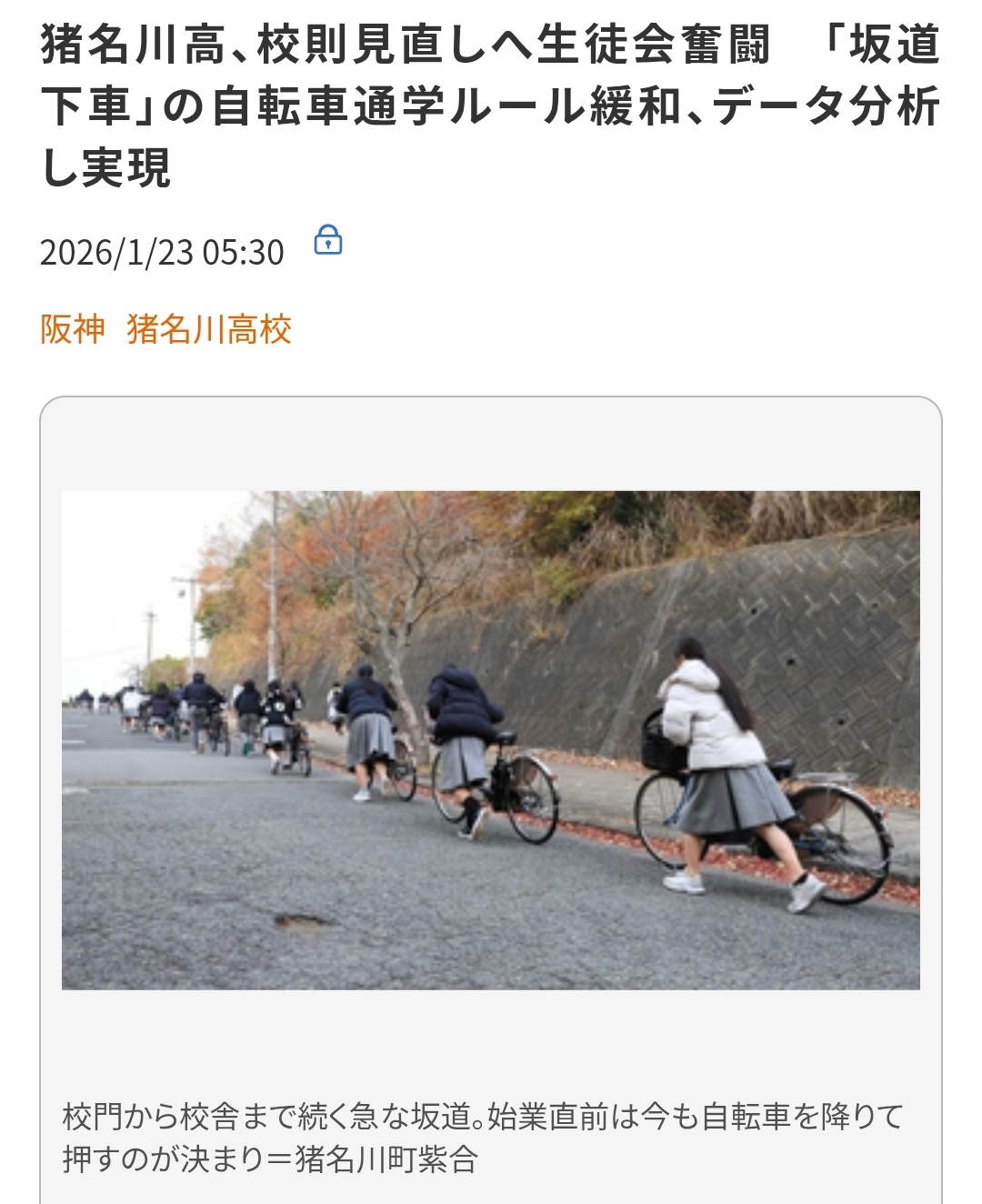 | … | 426/01/23(金)23:59:01No.1395283397そうだねx1「校門から校舎までの坂は自転車を降りて押して歩くこと」。猪名川高校(猪名川町紫合)で昨秋、長く続いていた「坂道下車」の校則が、生徒の提案で見直された。もともと事故防止のルールだが、近年の酷暑などを受けて改善を求める声が根強かった。生徒会メンバーが実態を分析して学校に条件の緩和を求め、生徒にはルールの順守を啓発している。(小林良多) |