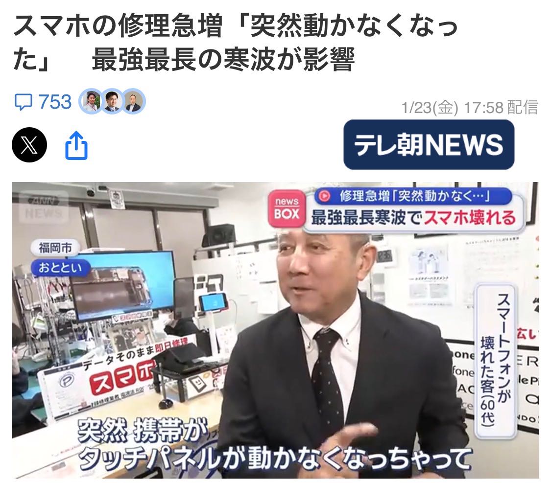 | … | 826/01/24(土)10:55:32No.1395355776そうだねx4寒さに強いスマホくだち! |