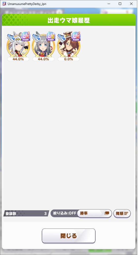 | … | 3626/01/24(土)12:24:49No.1395376246+オグリ弱いって言ってるのいるけど勝率95%で負けたのオグリだけだったのだ |