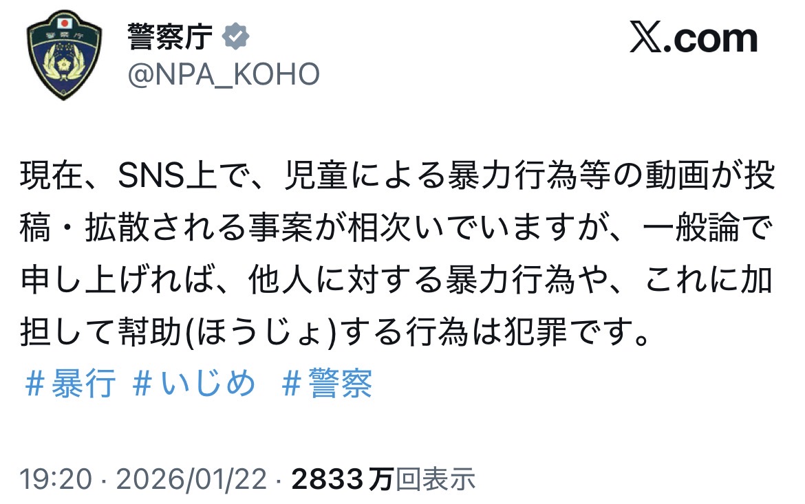 | … | 8126/01/24(土)14:26:16No.1395406245+暴力行為は犯罪なのだから件の暴力動画の少年を犯罪者として逮捕しようって警察は言ってるんだよな? |