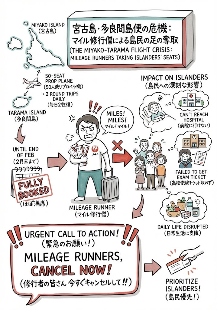 | … | 21126/01/24(土)21:09:12No.1395523832そうだねx2めちゃくちゃ簡単な解決方法があって多良間便をマイル対象外の路線にすればいいだけです |