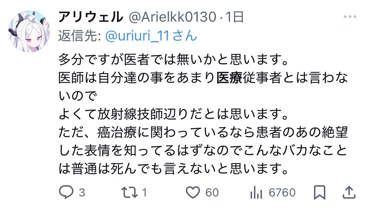 | … | 3226/01/24(土)21:58:16No.1395543970そうだねx8>がん患者を馬鹿にしてるんですけおおおおおお!!!!! |