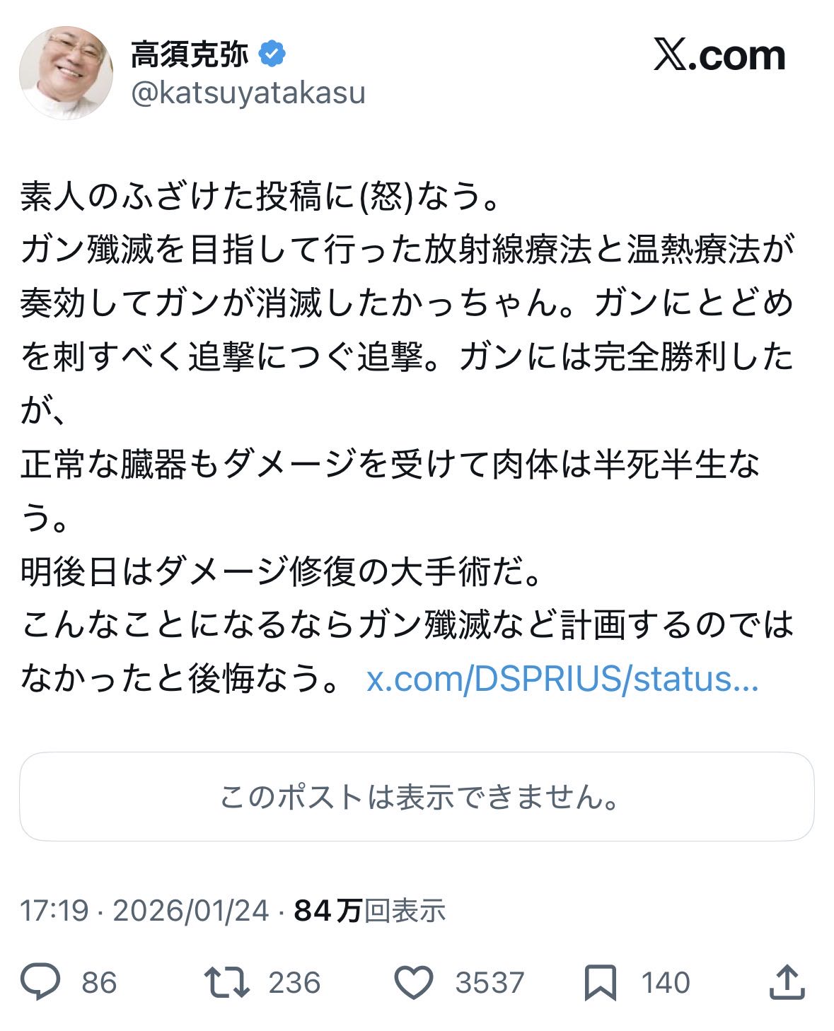 | … | 83326/01/24(土)22:55:36No.1395568131そうだねx6>https://x.com/katsuyatakasu/status/1057912933047447552?s=20 |
