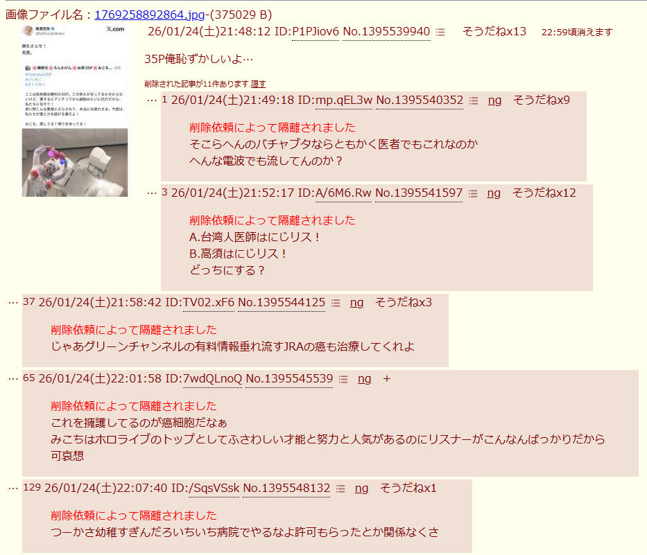 | … | 2126/01/24(土)21:56:21No.1395543171そうだねx12<カバー株式会社 誹謗中傷通報専用窓口> |