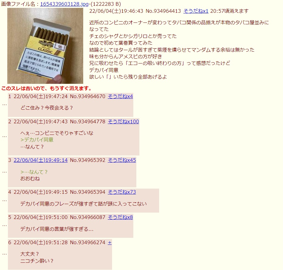 | … | 12526/01/25(日)02:40:50No.1395632333+タバコのスレ切っ掛けで流行らせようとする奴が使いまくった挙句に概ねの意図すら伝わらないまま広まったけど |