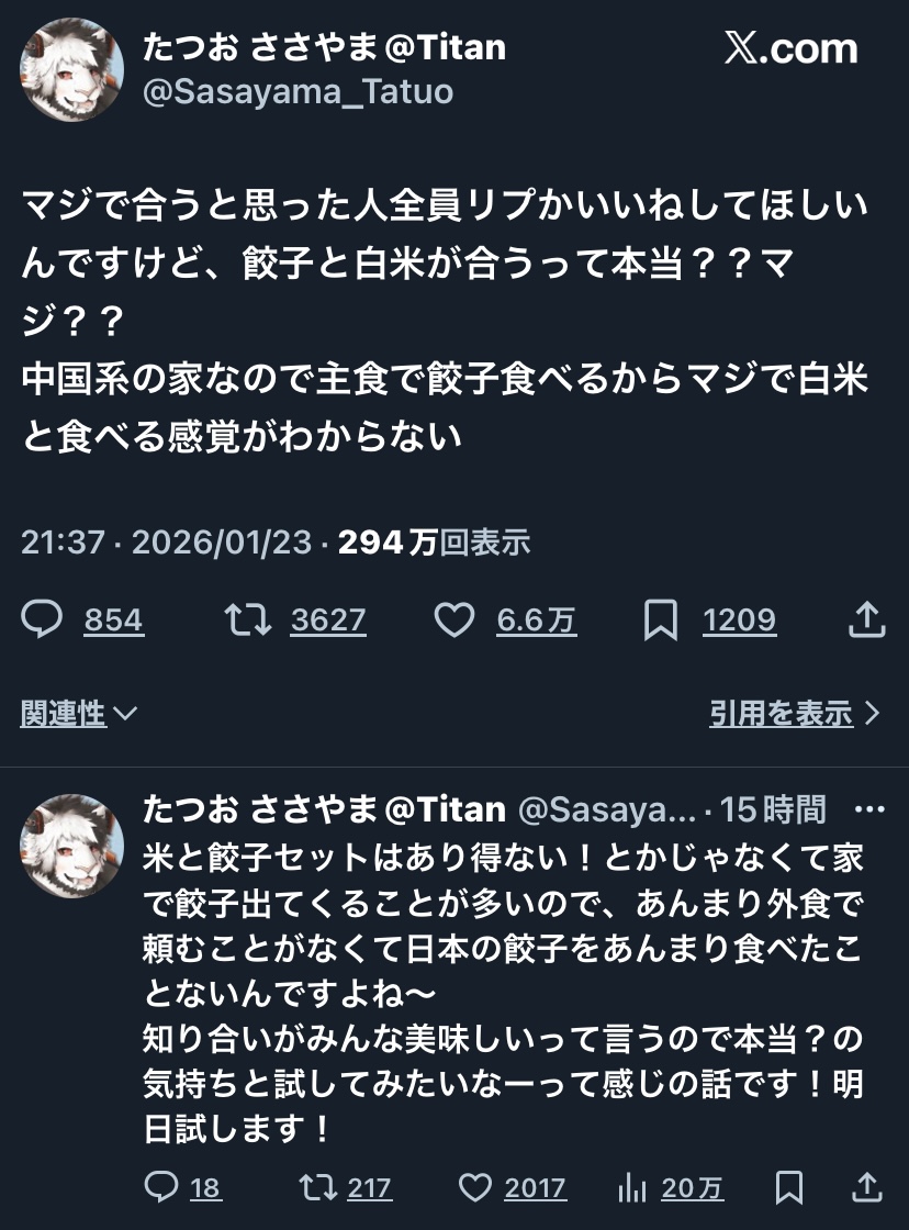 | … | 2026/01/25(日)06:08:09No.1395642642+日本の餃子は皮が薄くてタレのせいで味が濃くて別に主食が必要なポジションなんだよな |