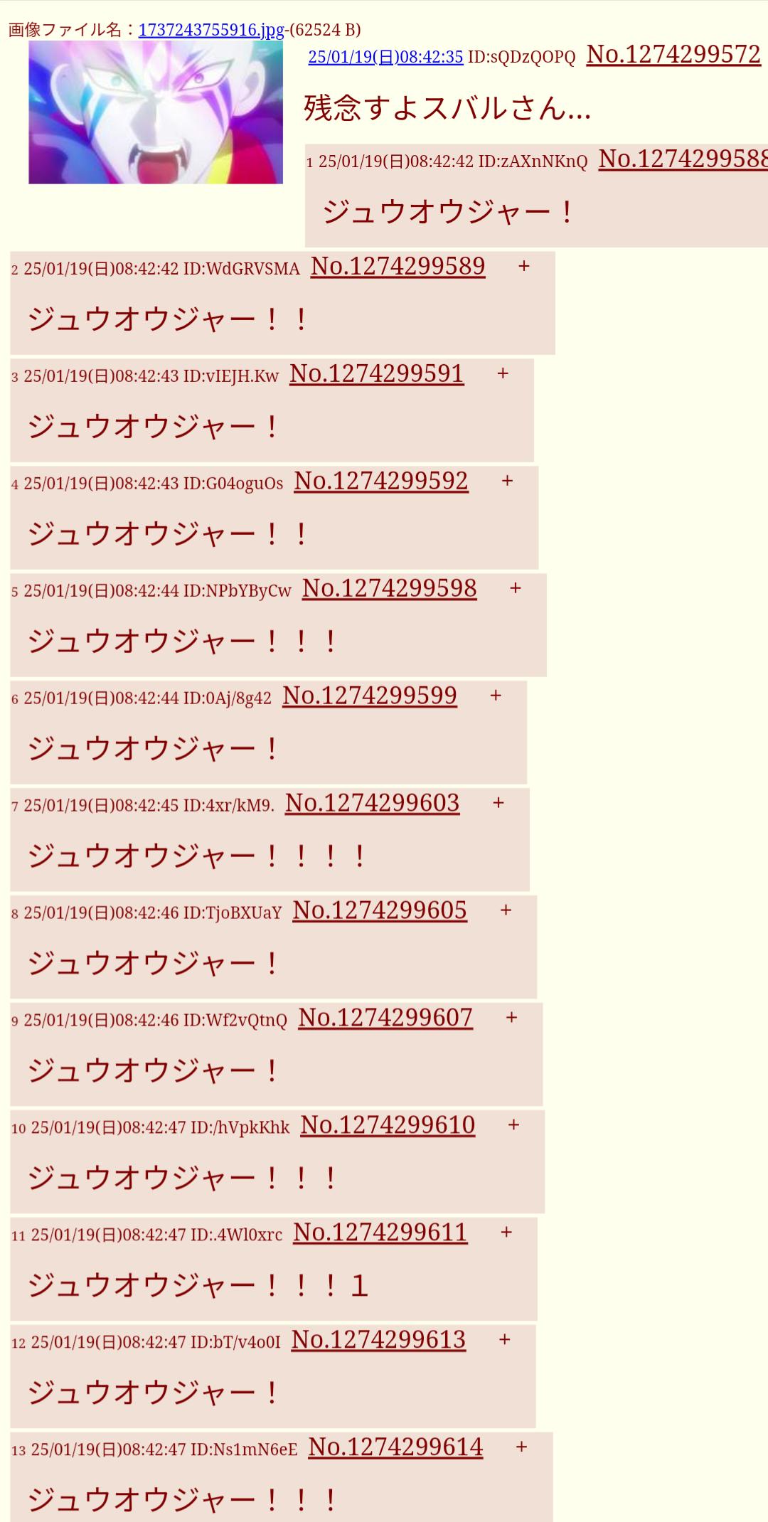 | … | 626/01/25(日)08:58:58 ID:wtWr5arkNo.1395658828+ジュウオウジャーーー!! |