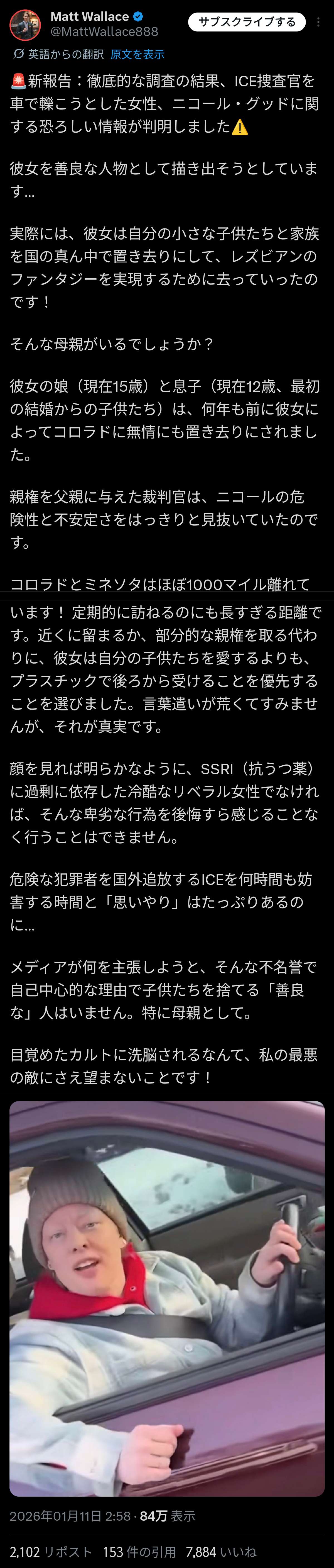 | … | 7426/01/25(日)12:09:00No.1395706325そうだねx4>>前に車に乗った主婦がICEに殺されたって騒がれた時は |