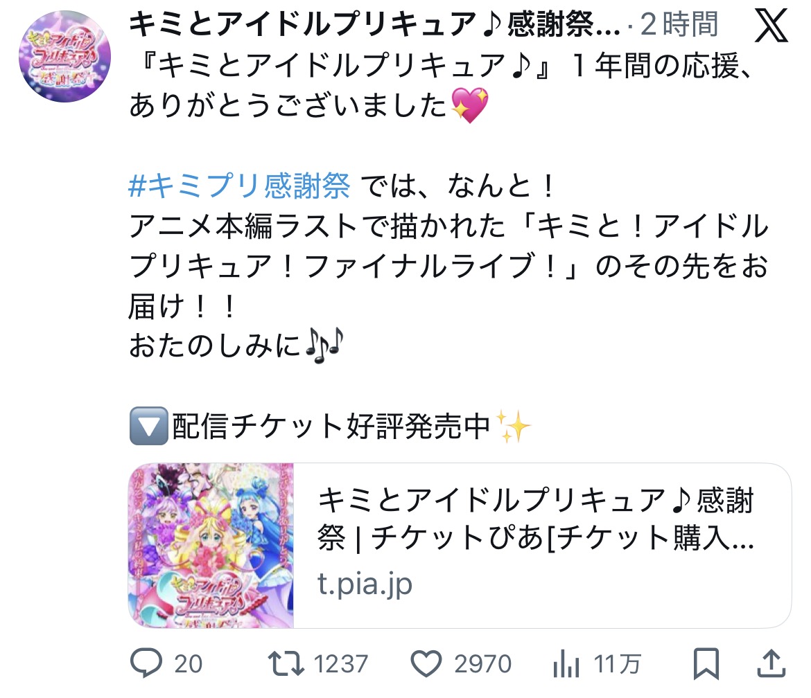 | … | 8326/01/25(日)11:55:32No.1395702977+時決戦に向けて用意してたライブがあの時点でファイナルライブになってたのって既にアイドルプリキュアの活動はこれが最後って想定してたのかね |