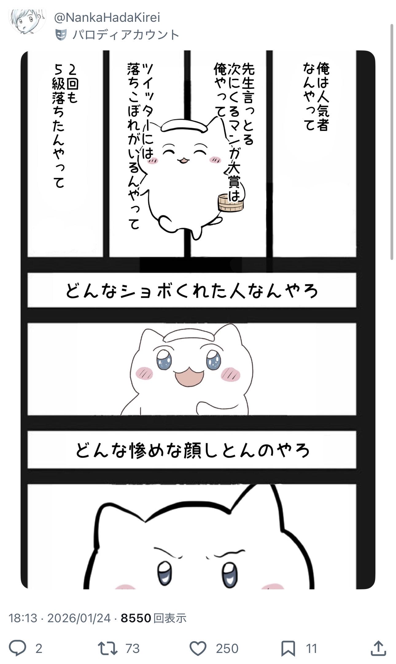 | … | 17926/01/25(日)13:53:09No.1395734478+『漫画家先生』になれないまま先生ぶってるのが一番痛いとこ |