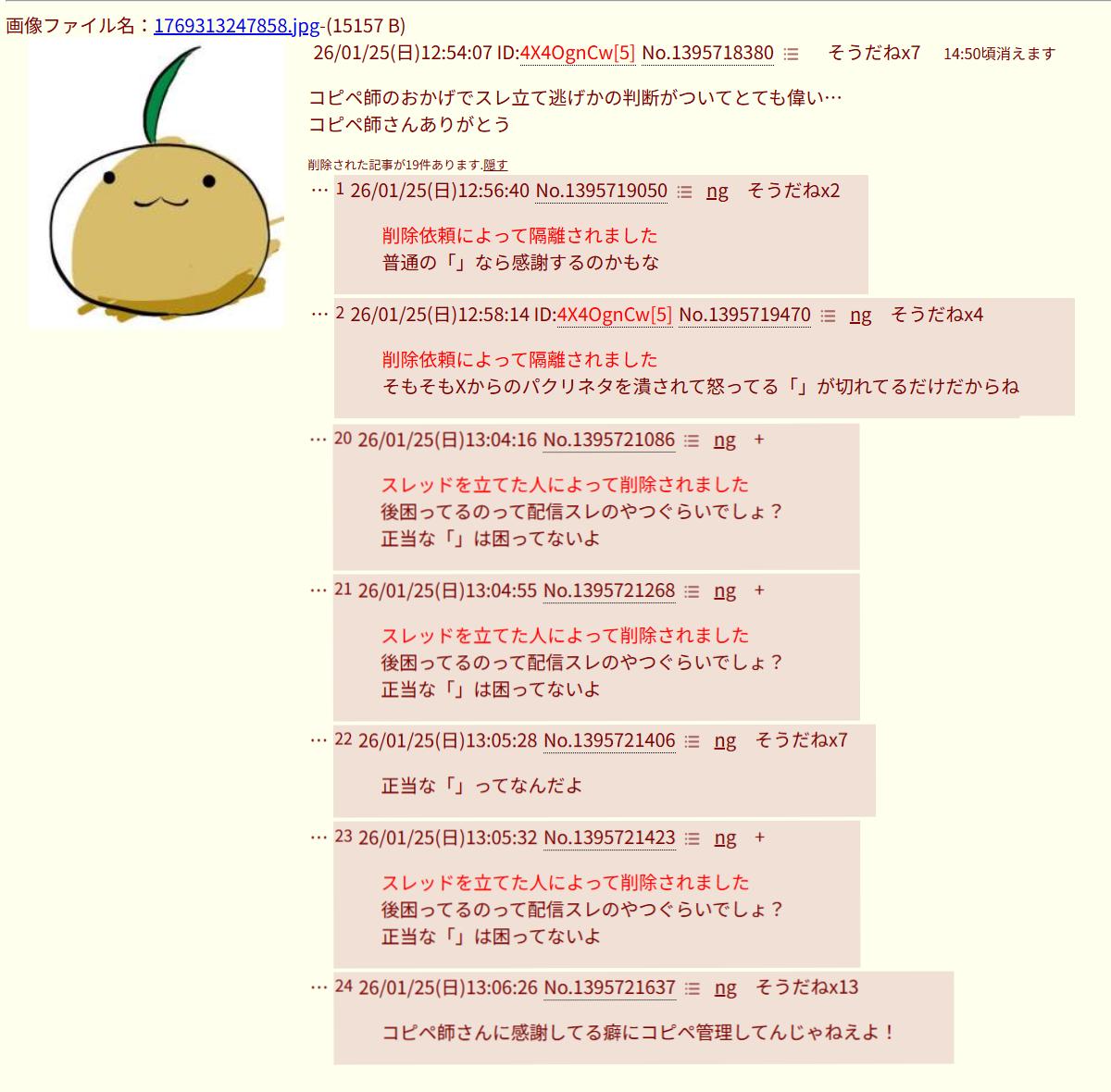| … | 6126/01/25(日)13:17:18No.1395724592そうだねx10なんで自分のスレのコピペ消すの? |