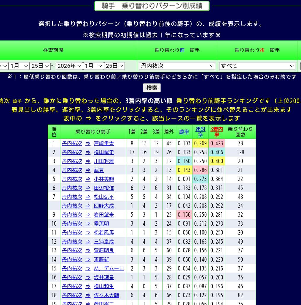 上のサイトで調べた丹内騎手の乗り替わりパターンのデータは