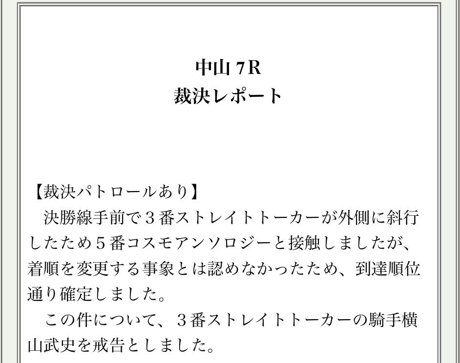 | … | 86526/01/25(日)17:10:20 ID:vZ9Xt5wsNo.1395784413+>・ストレイトトーカー号の騎手横山武史は、決勝線手前で外側に斜行したことについて戒告。(被害馬:5番) |