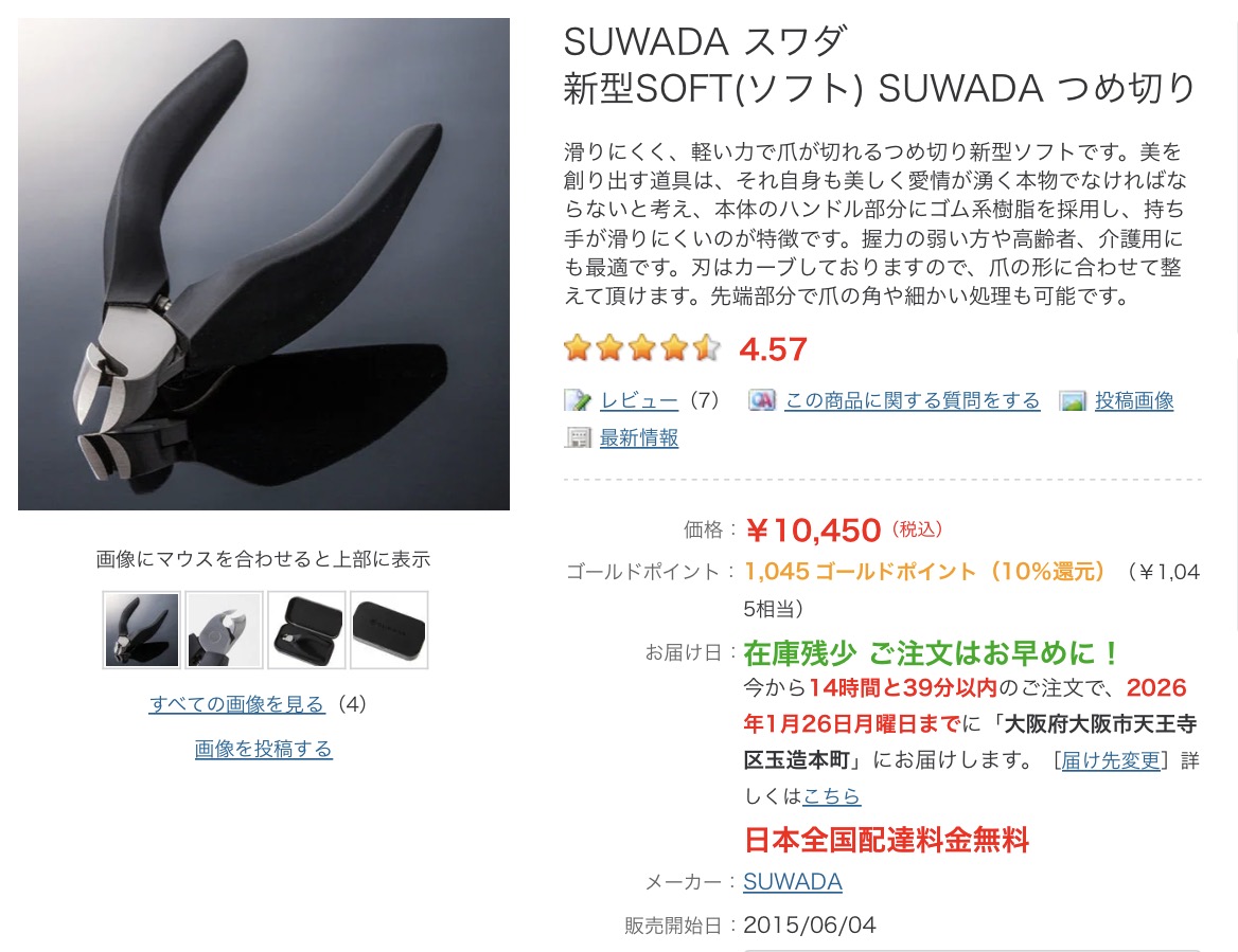 | … | 10526/01/25(日)16:57:46No.1395780910+スワダの爪切りは買ったことあるけど高すぎてリピはしなかった |