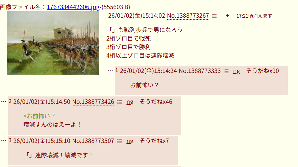 | … | 626/01/25(日)19:50:50No.1395837427+まあ頭のおかしい兵法だし… |