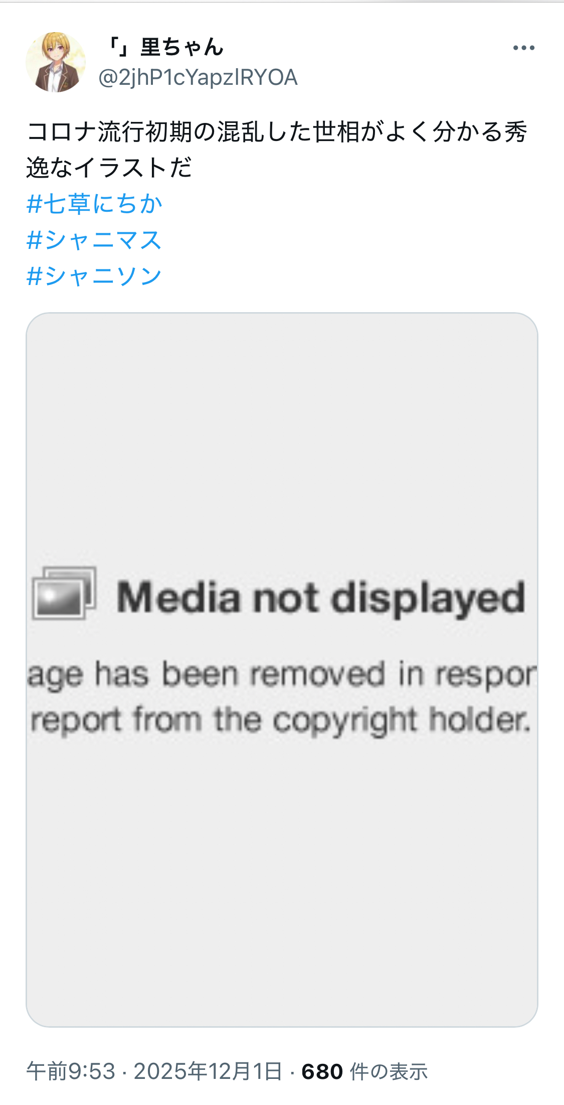 | … | 29826/01/25(日)22:25:27No.1395899893+>描いた奴が炎上して垢消しまでする羽目になった絵を後生大事に保存してタグまでつけて勝手にアップしてんだからそりゃ消されるわな 敗北宣言コピペ |