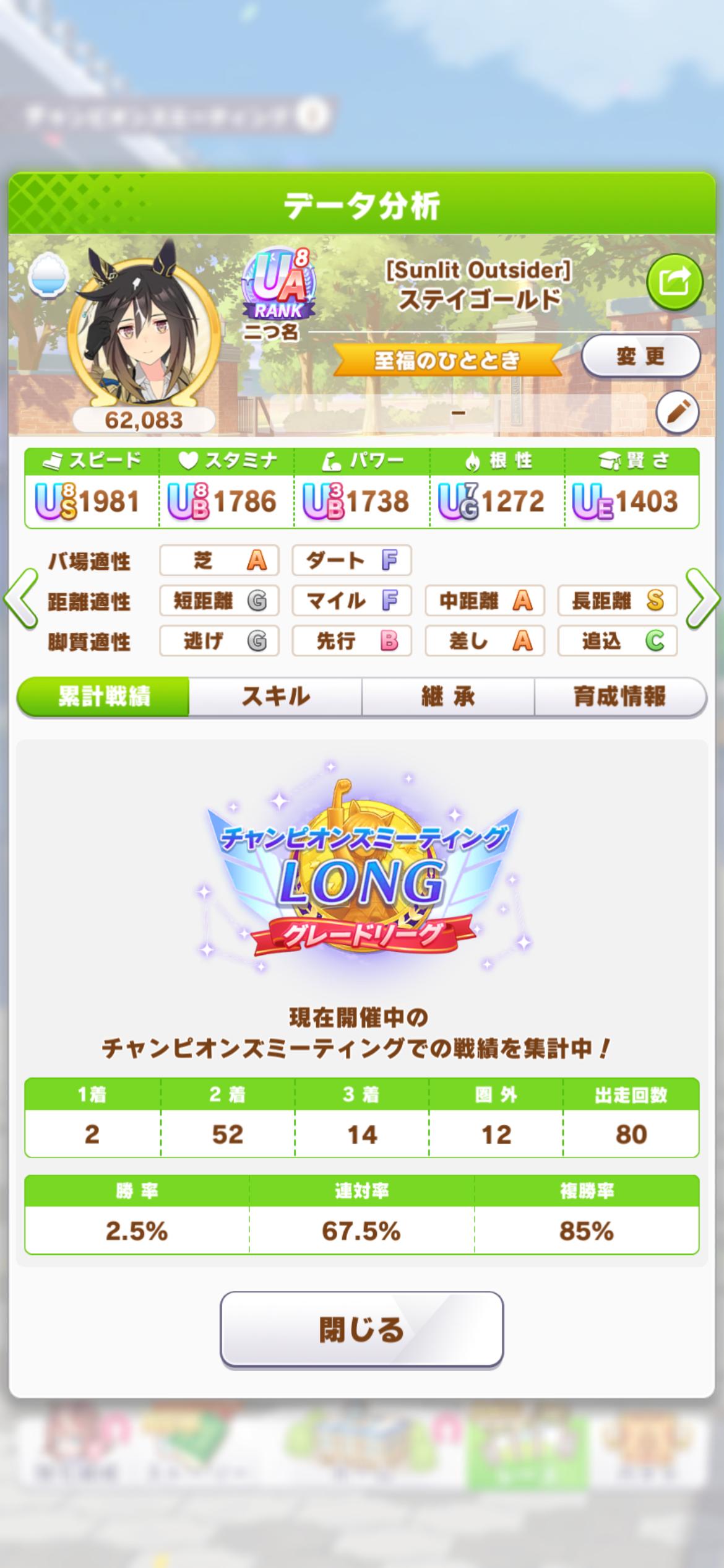 | … | 17226/01/26(月)01:37:56No.1395956257+他は文句ないしスタもたぶんカンストなのに根性1100くらいのはわりと見るのだ |