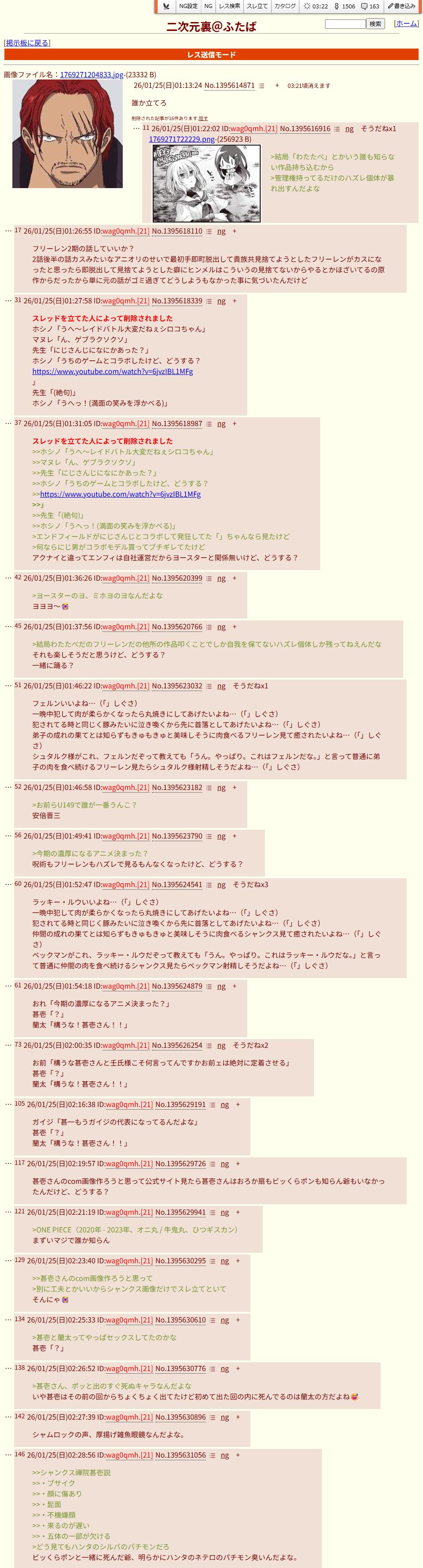 | … | 726/01/26(月)08:21:11No.1395980085そうだねx1シャンクスレ廃れたな |