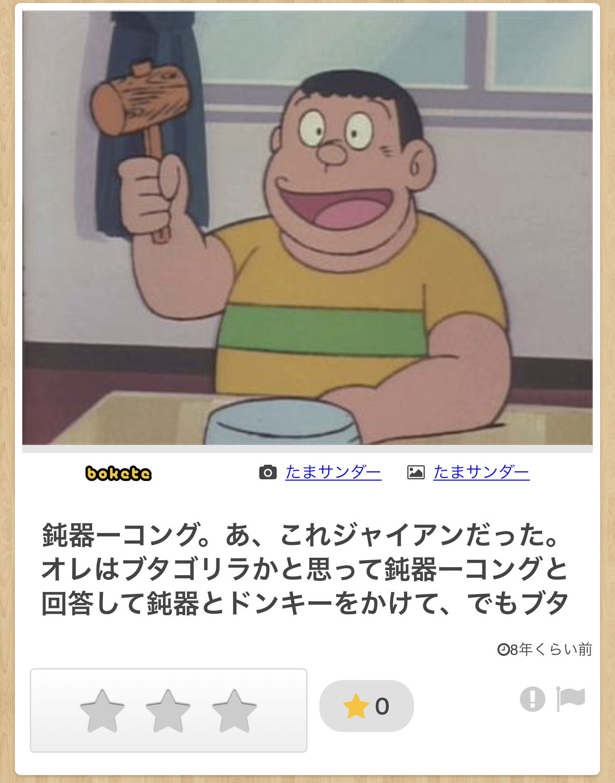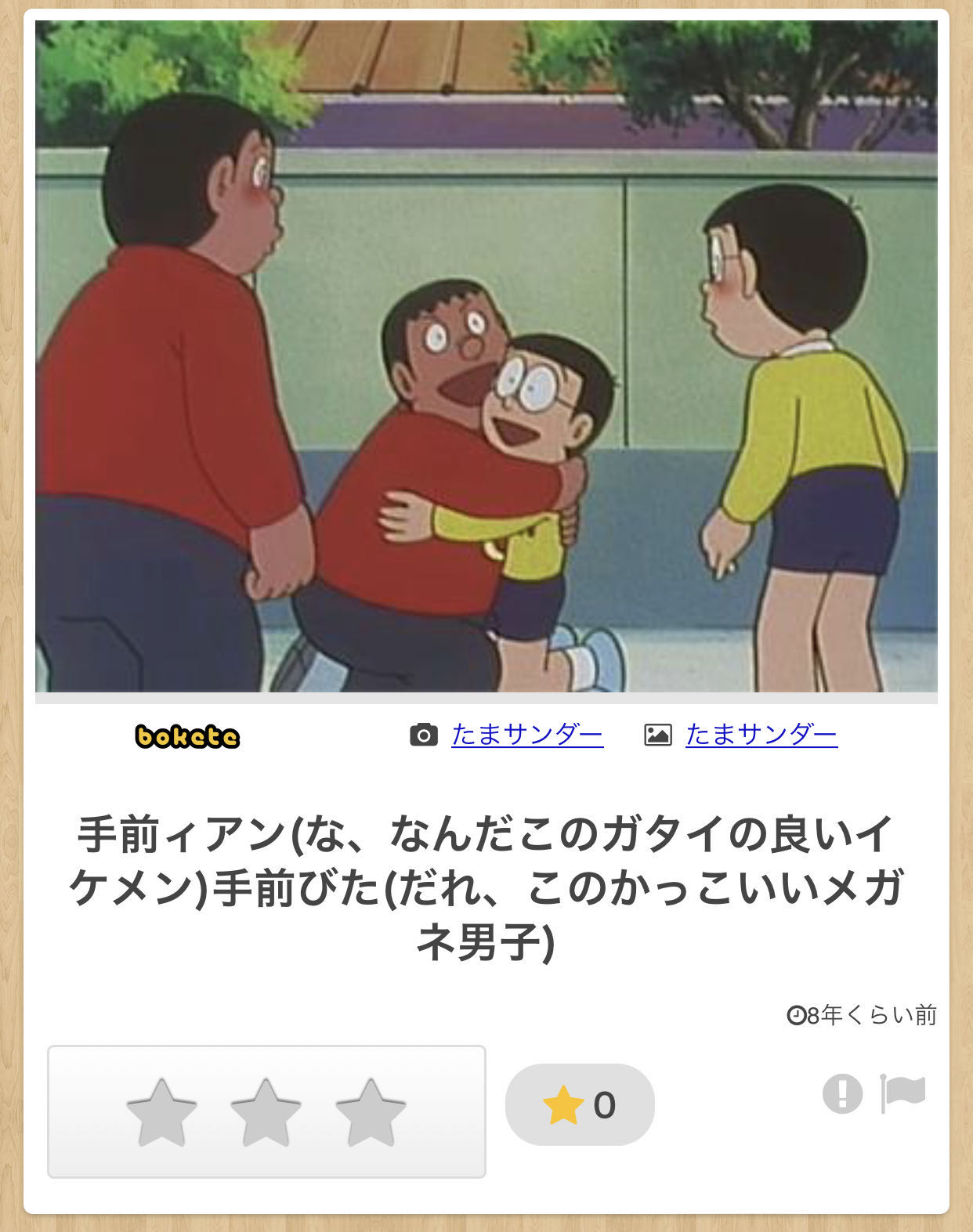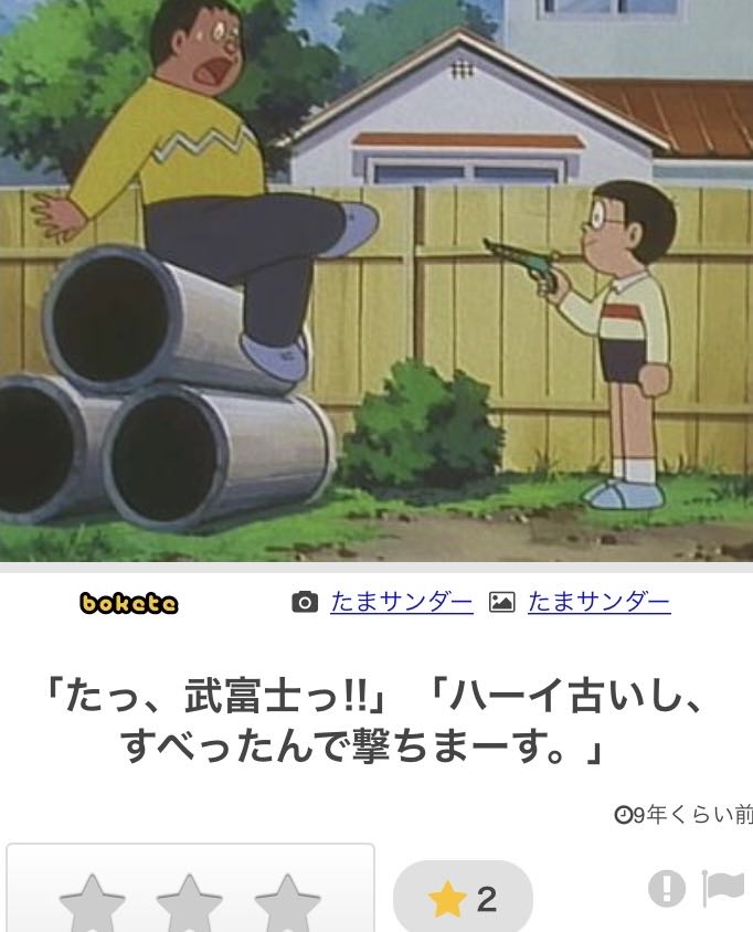 | … | 5626/01/26(月)11:46:48No.1396010090そうだねx5たまサンダーはboketeにのぶドラの画像をお題として投稿してる人であって このボケを考えているのはたまサンダーとは別のユーザーであるという事を知らない人もまだ多そう |