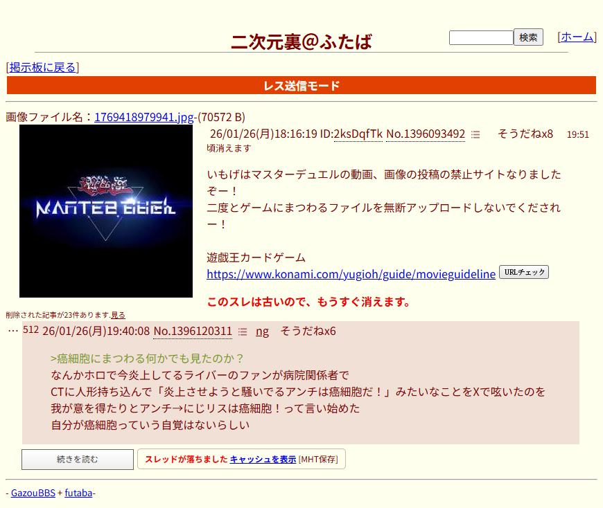 | … | 926/01/26(月)19:45:26No.1396122244+書き込みをした人によって削除されました |