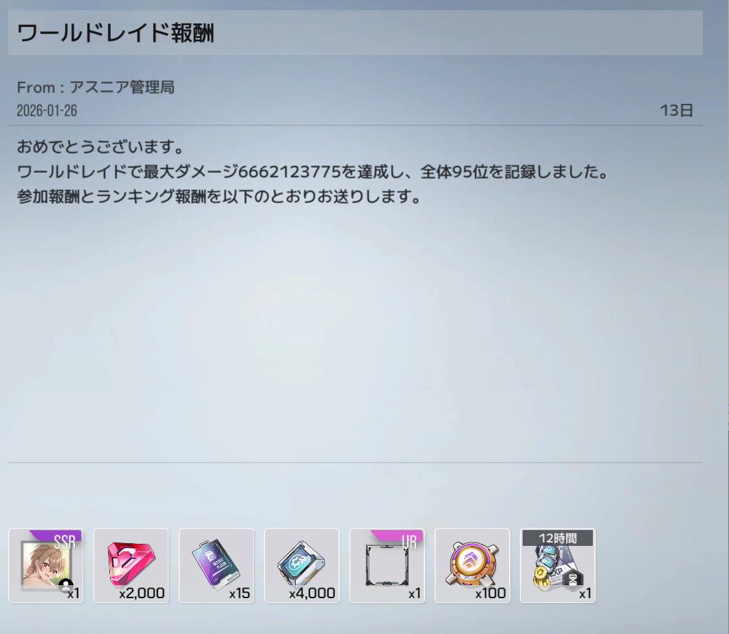 | … | 126/01/26(月)19:33:46No.1396118047+ワールドレイドランキング508位でした…508位でした… |