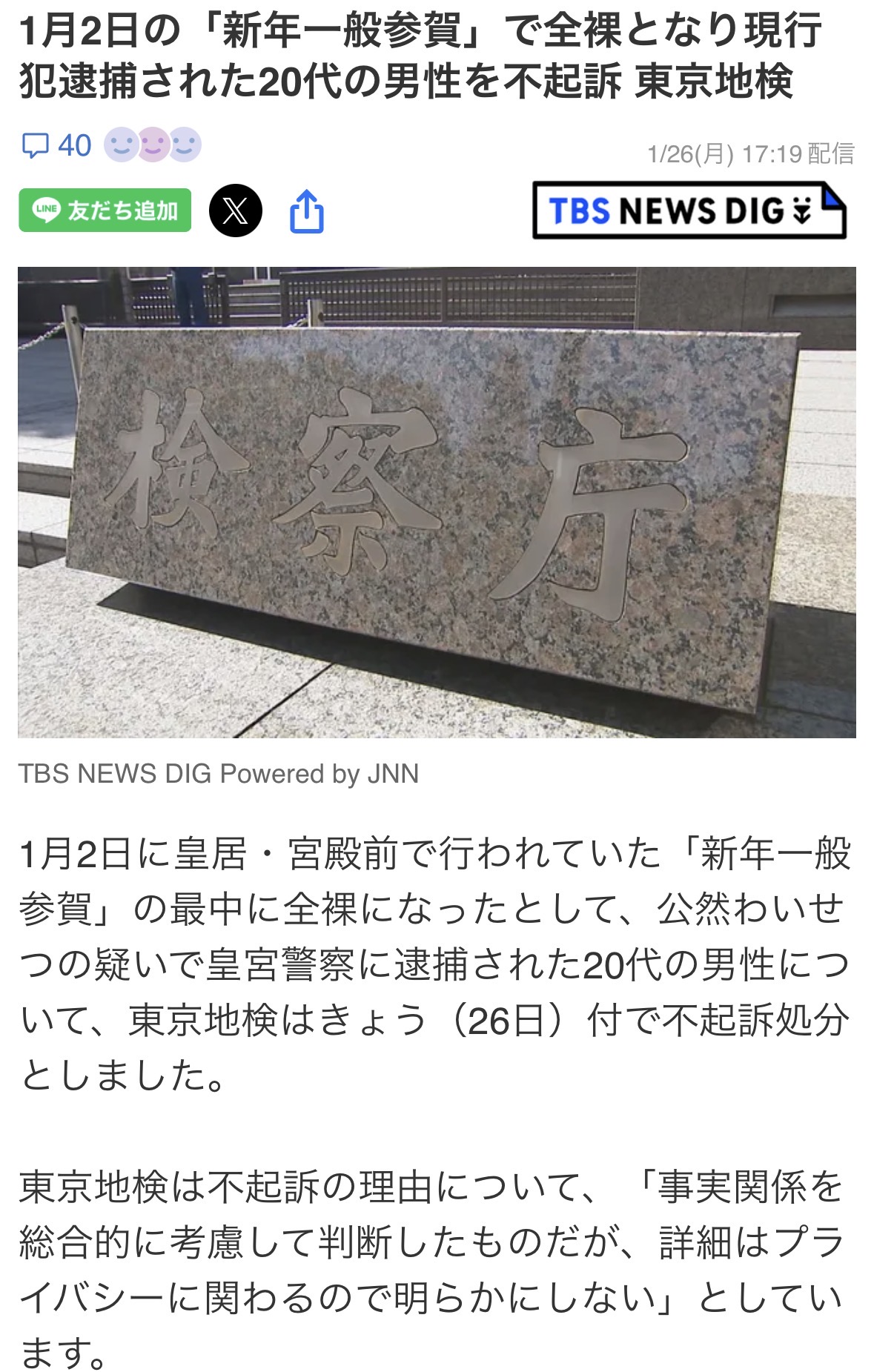| … | 10126/01/27(火)06:04:39No.1396261930+ニュース眺めてると一時的に話題になった事件なんかでも案外不起訴多いよな |