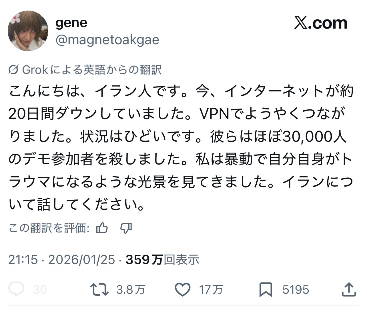 | … | 2626/01/27(火)05:46:56 ID:ohXL0RLoNo.1396261290そうだねx1当局の発表だと死んだのは3400人だけど |