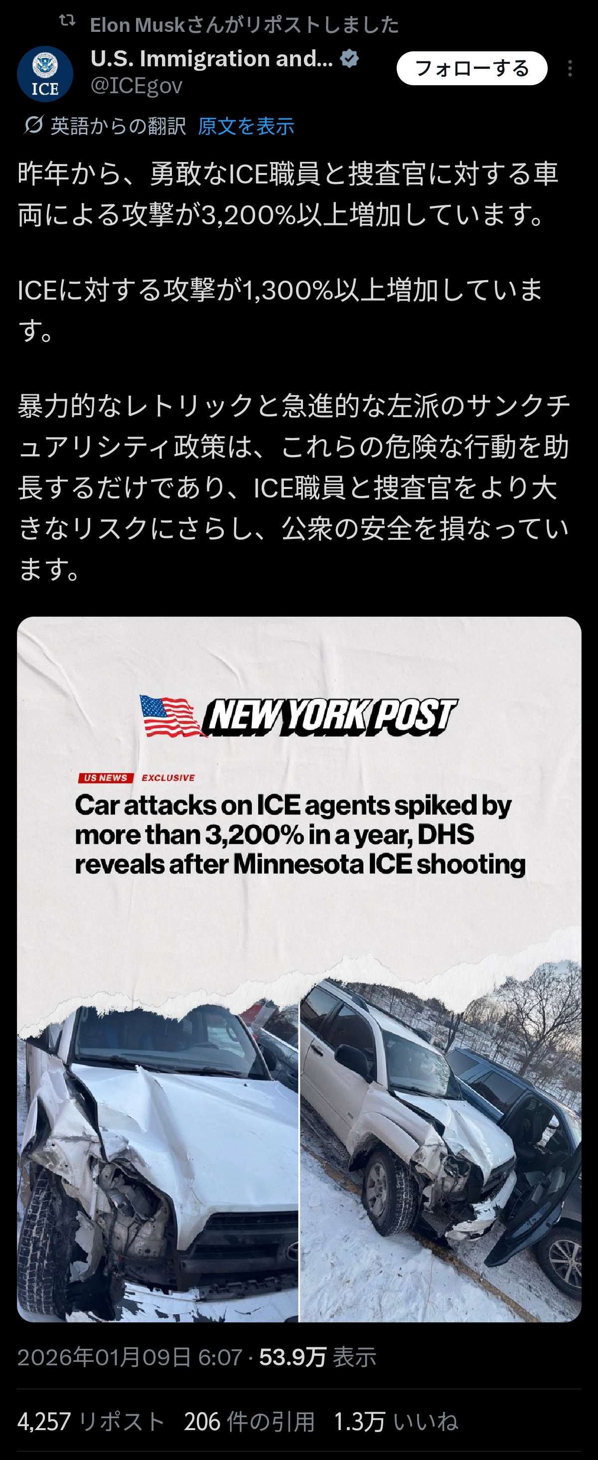 | … | 3926/01/27(火)05:49:07No.1396261376そうだねx1>無辜の民がICEに罪もないのに殺されています! |