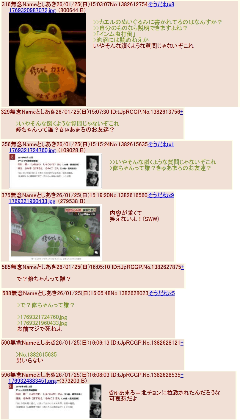 | … | 13226/01/27(火)06:35:02No.1396263146+>元気なのはお前らネトウヨだろうが |
