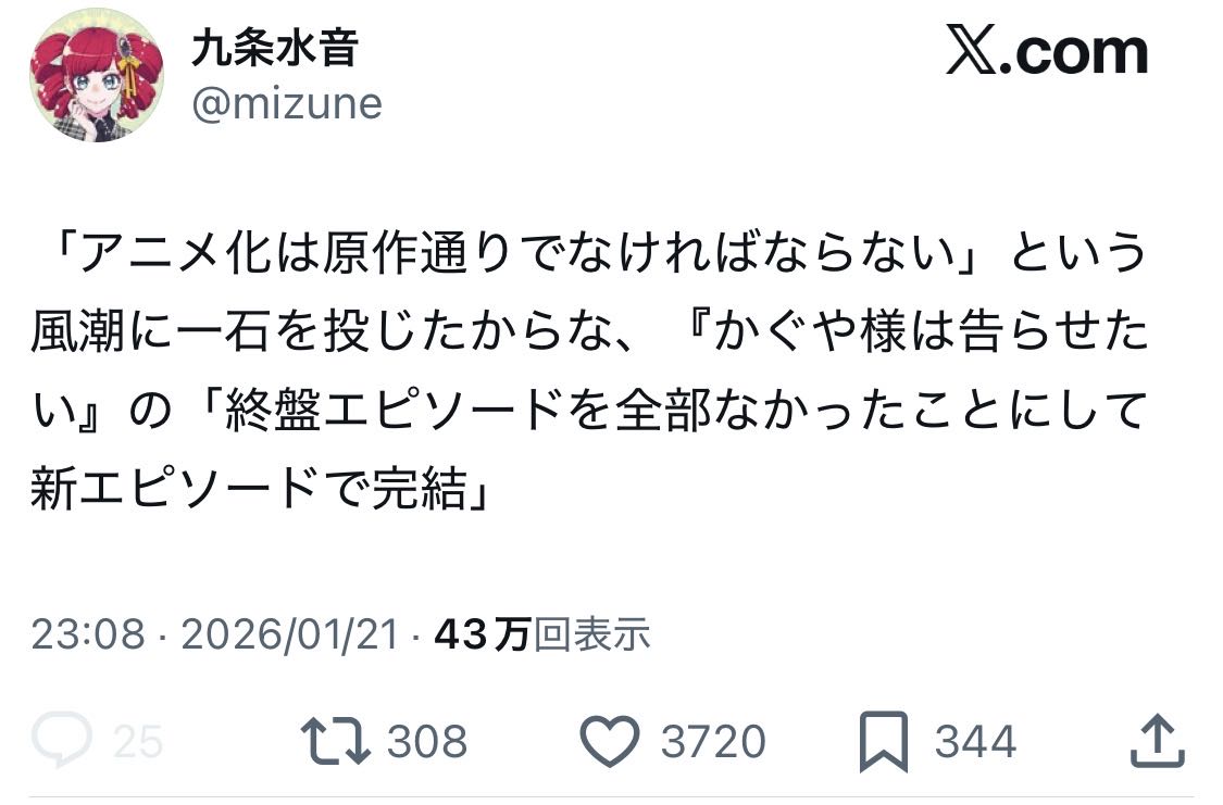 | … | 5226/01/27(火)10:20:32No.1396290528+かぐや様のアニメってラスト違うんだ… |