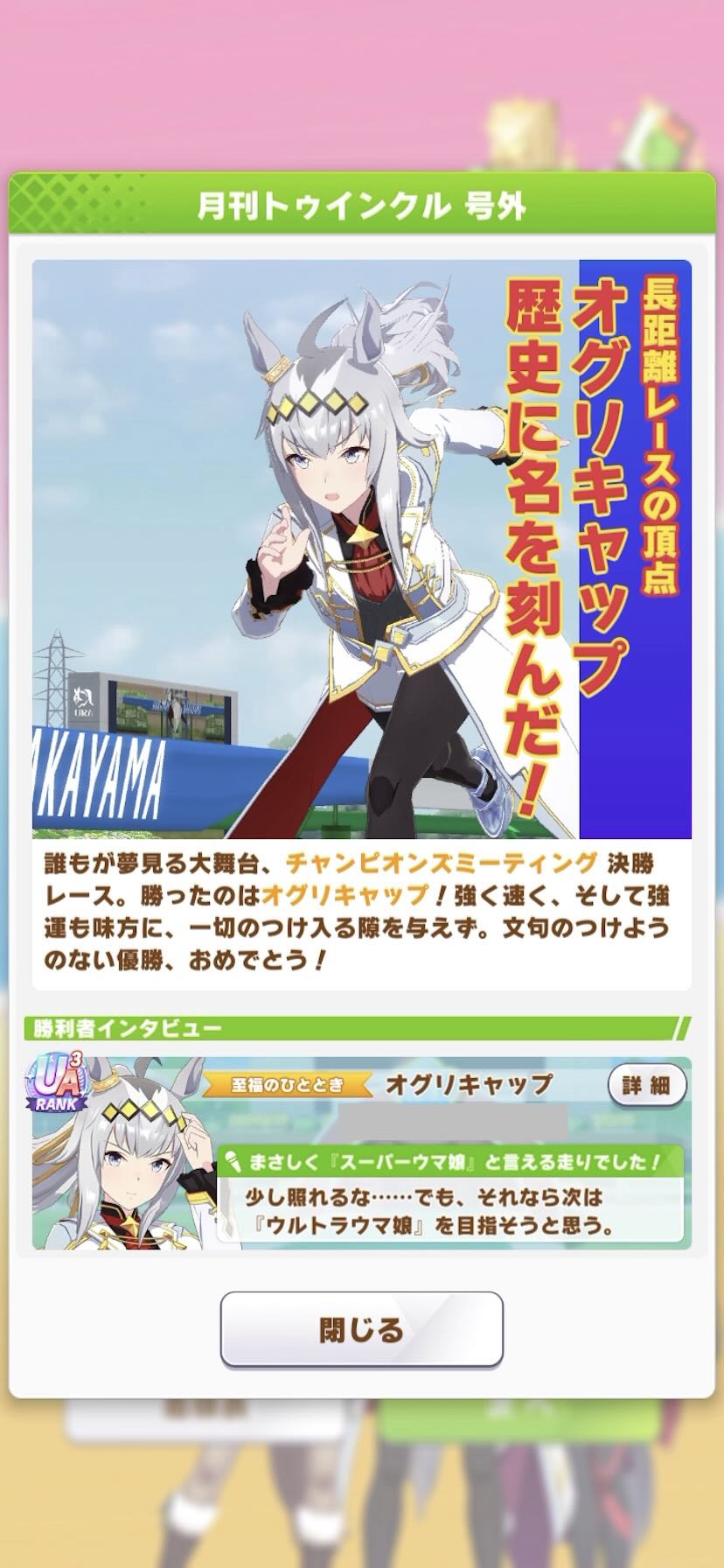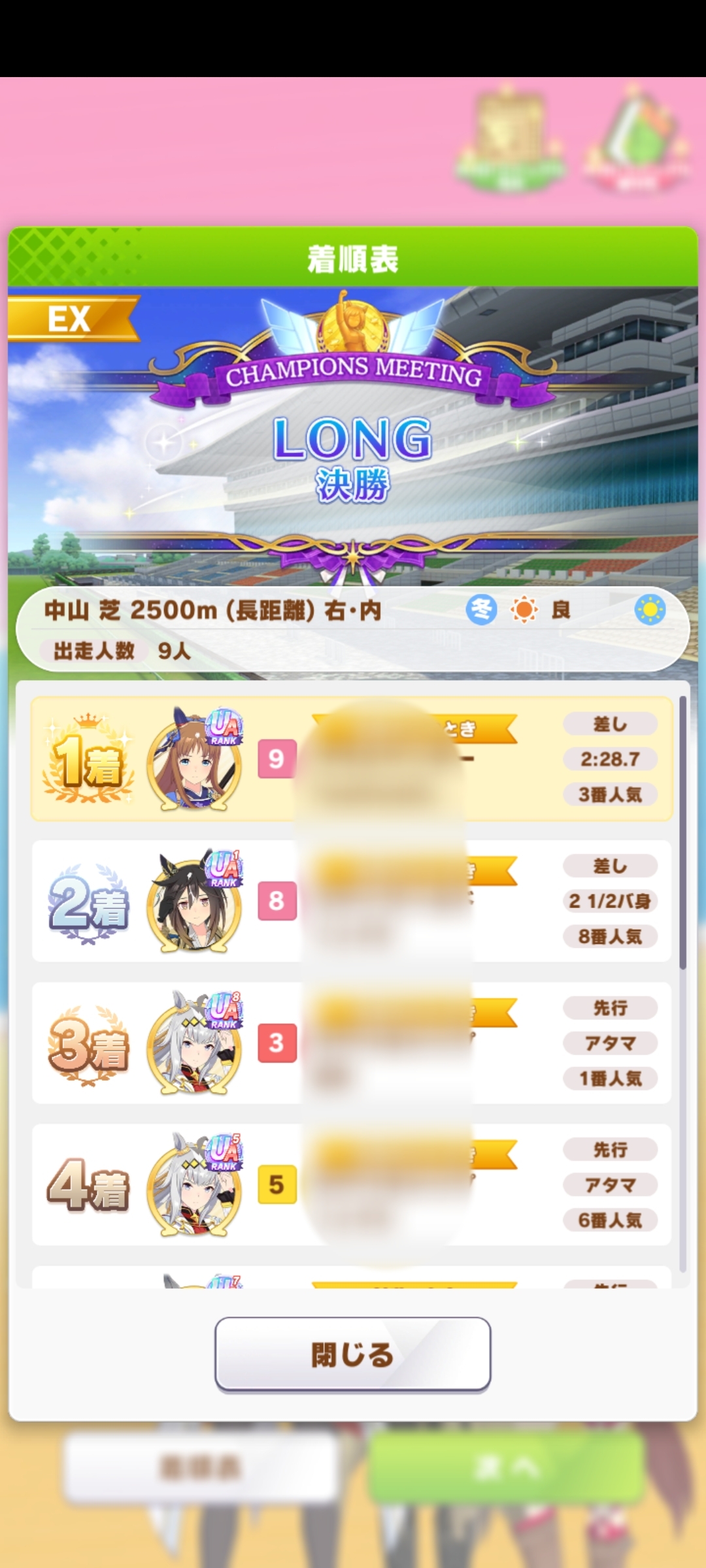 | … | 36326/01/27(火)12:43:02 ID:.rSJssUwNo.1396320666+>>ってか赤キタちゃんの固有で主題歌流れるんですねいつも飛ばすので初めて知りました >👀クスン >💧 でも3位ですよ3位!ネイチャさんと一緒です |