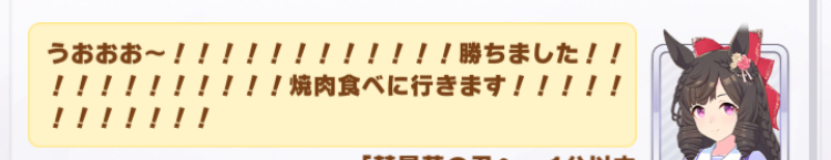 | … | 38326/01/27(火)12:50:22 ID:UuAhnop6No.1396322762+わーい勝てました でも相手が無人島育成の子だしてたりUSブライアンちゃんでも賢さ700台だったりで運だなと思いました |