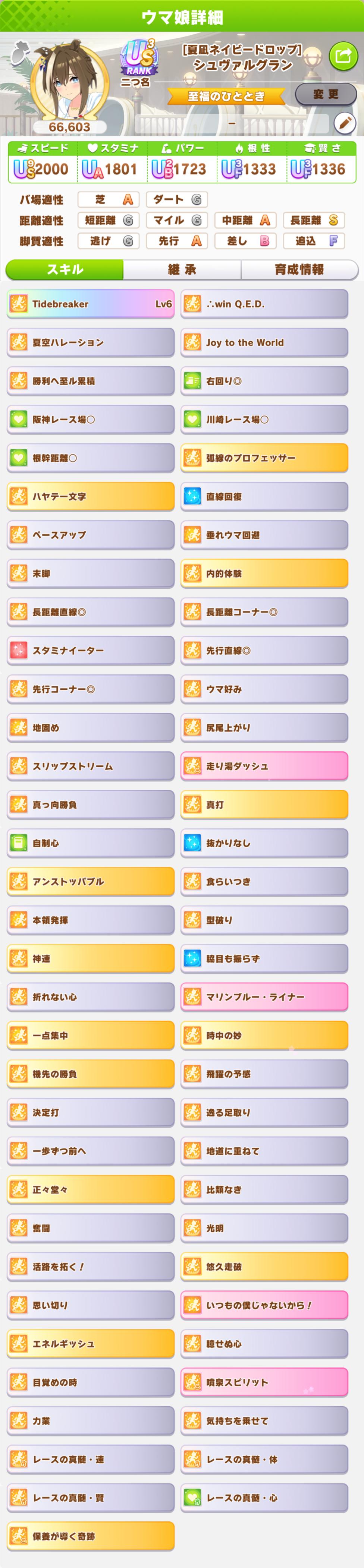 | … | 37726/01/27(火)12:46:31 ID:gbAo4k0gNo.1396321703+今回のシュヴァちです 固有継承しきれずにスキポ余ったので無駄スキルちょいちょい付いてます あと緑スキル盛大に事故ったので好調以上じゃないと地固めでません 予選オグリさんに負けてたのはそこかなぁって思いました fu6219616.jpg |