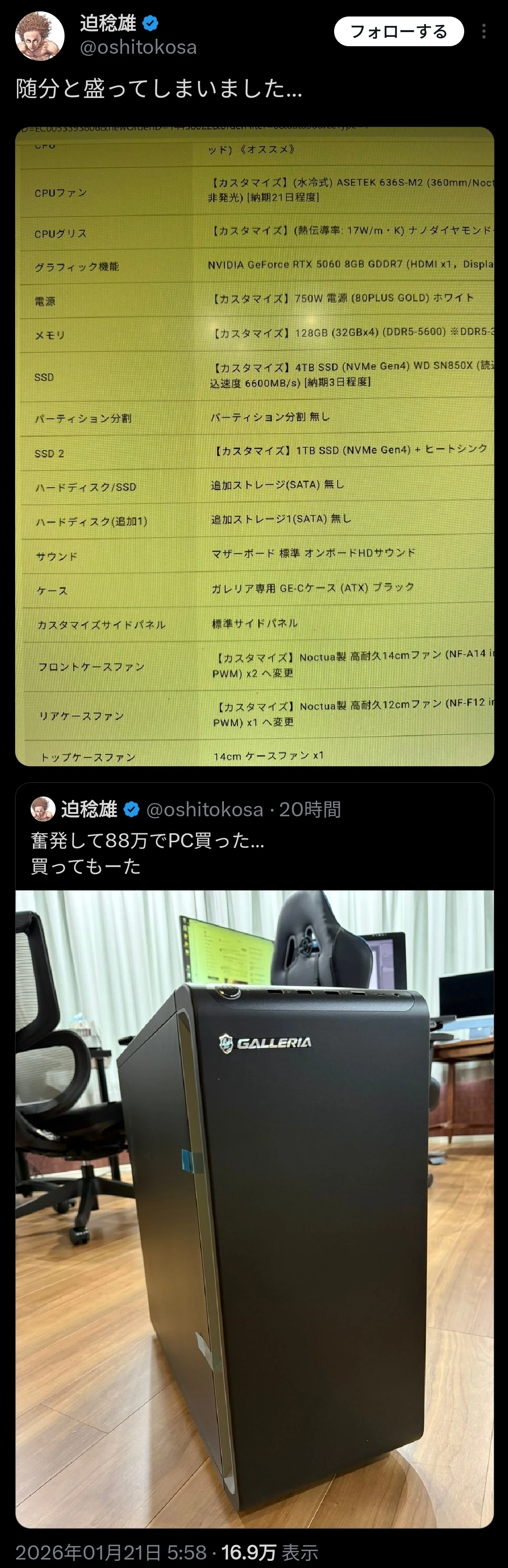 | … | 1826/01/27(火)12:34:02No.1396318016+ちょっと前でも5080+9950x(non3D)+96GB+SN81004TBみたいな最上位買えない酸っぱい葡萄スペシャルでも66万ぐらいだったのに猫の界隈 |