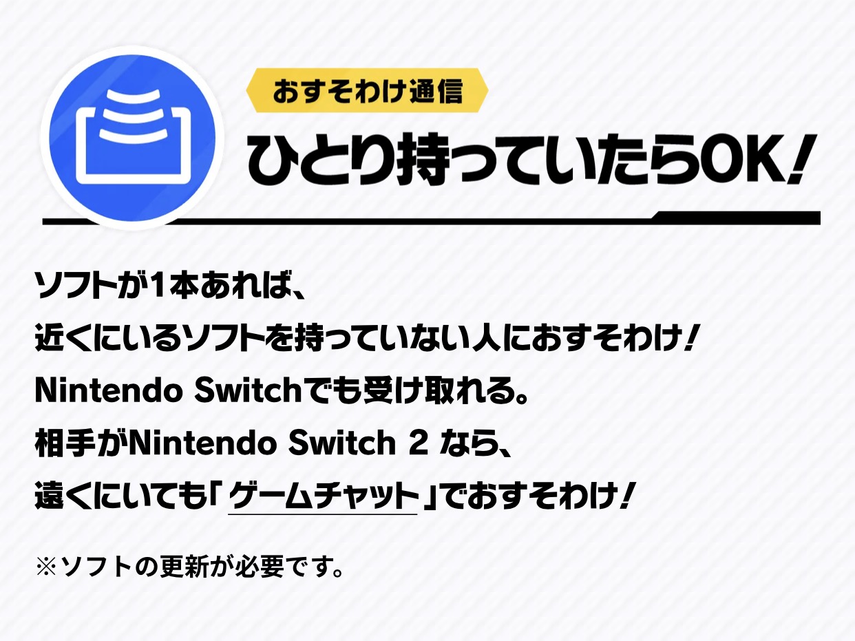 | … | 1226/01/27(火)19:09:16No.1396407116+友達いないから試せないけどお裾分けって一人がSwitch2持ってれば他の友達がSwitchしか持ってなくても遊べるってこと? |