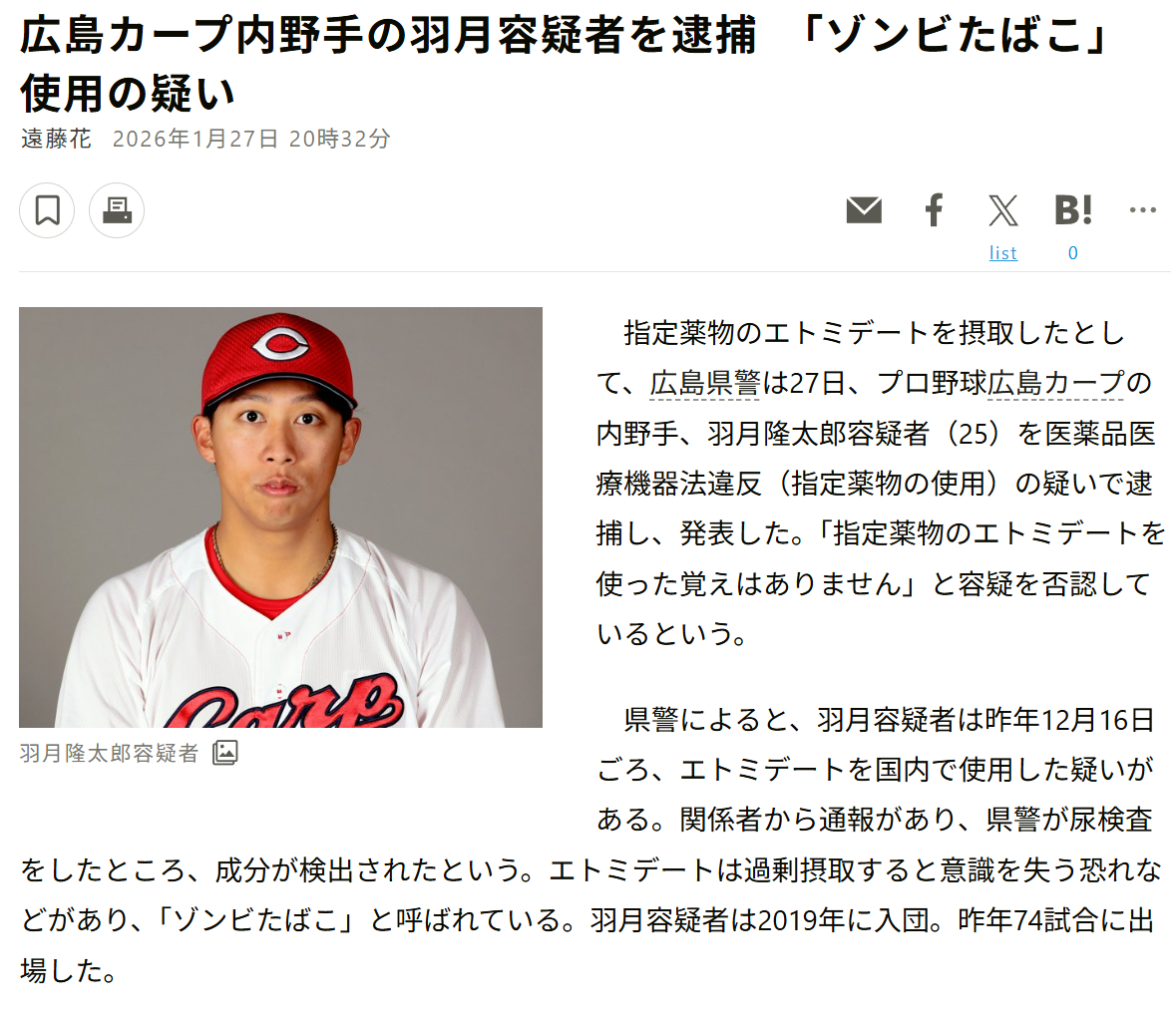 | … | 55126/01/27(火)21:47:02No.1396467568+まず現役選手の薬物逮捕の時点でプロ野球史でも相当上位の事件なんでそりゃあ大ニュースよ |