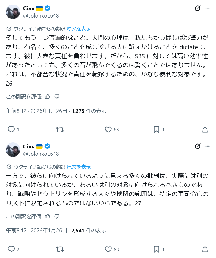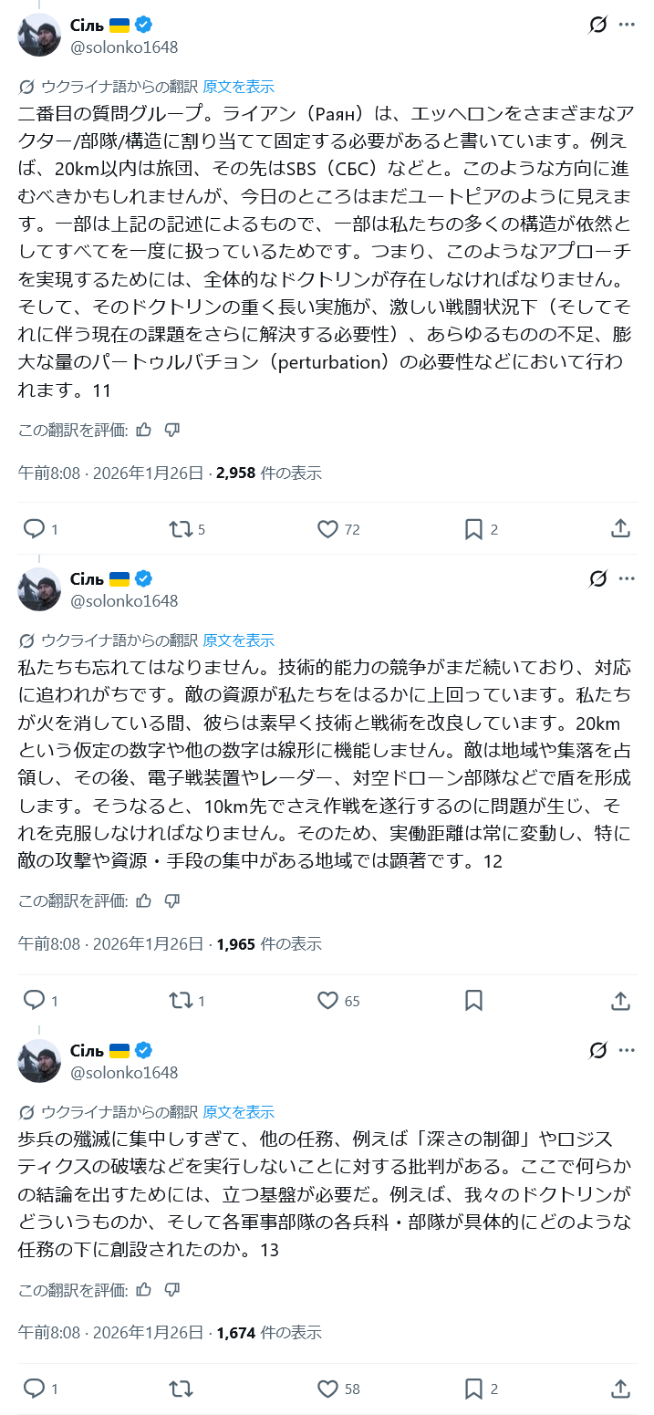 | … | 5726/01/27(火)21:13:55No.1396454026+>>先日ウクライナのドローン部隊が前線の歩兵が本当に倒してくれるもん倒してないって文句が前線から出てる |