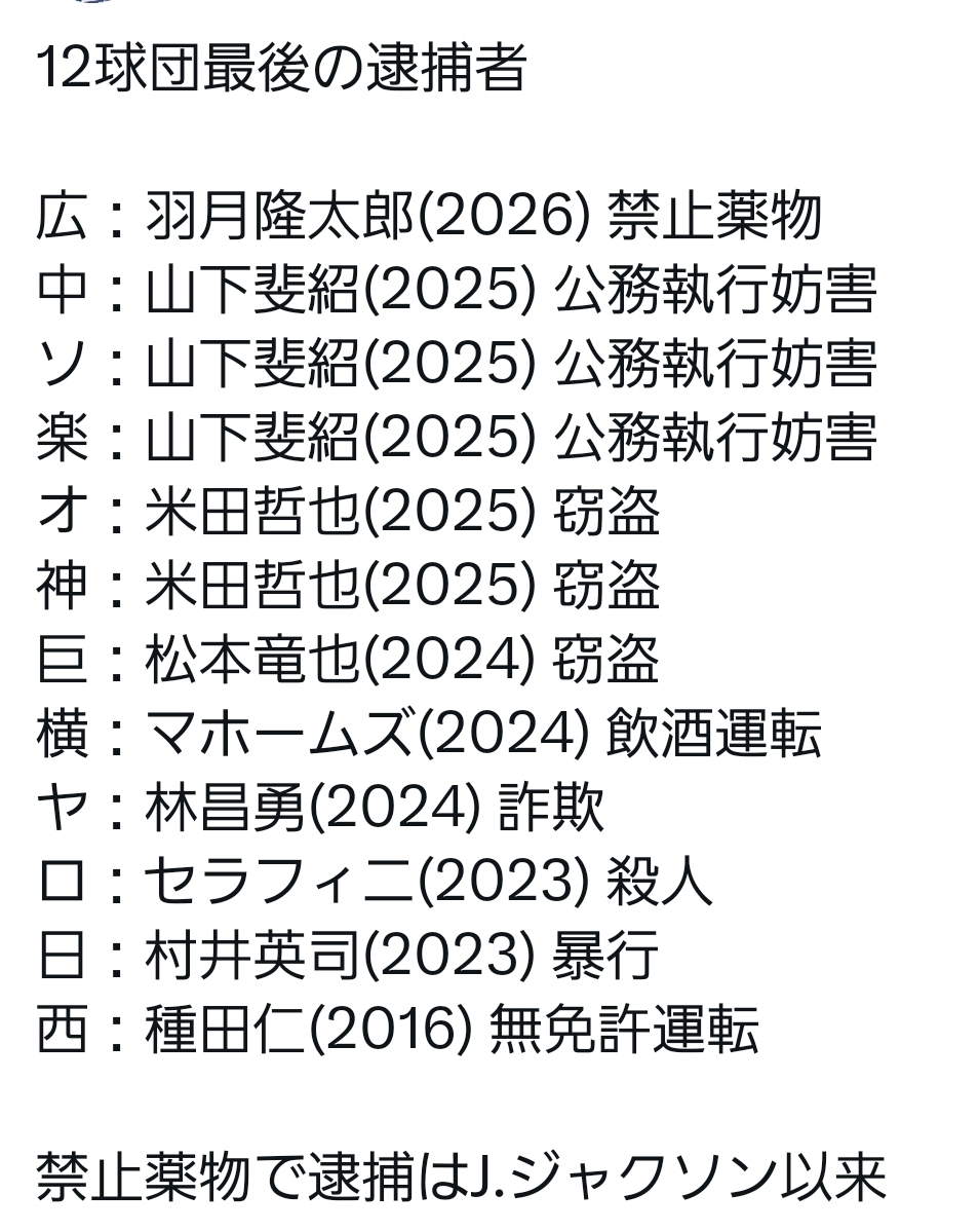 | … | 2826/01/27(火)23:53:58No.1396512455+>現役での逮捕ならともかく引退後に捕まった選手上げてもなぁ |