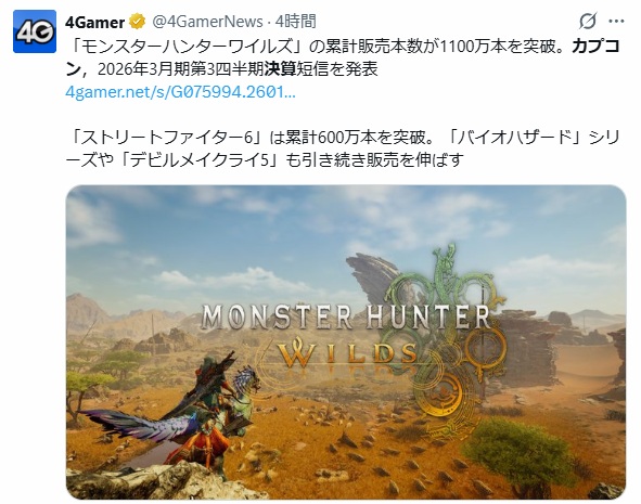 | … | 8026/01/28(水)00:43:56No.1396525718そうだねx6>ドグマ2からの連続5タイトルで通算5000万本目標なのでワイルズだけで2〜3000万本じゃないと到達出来ない |