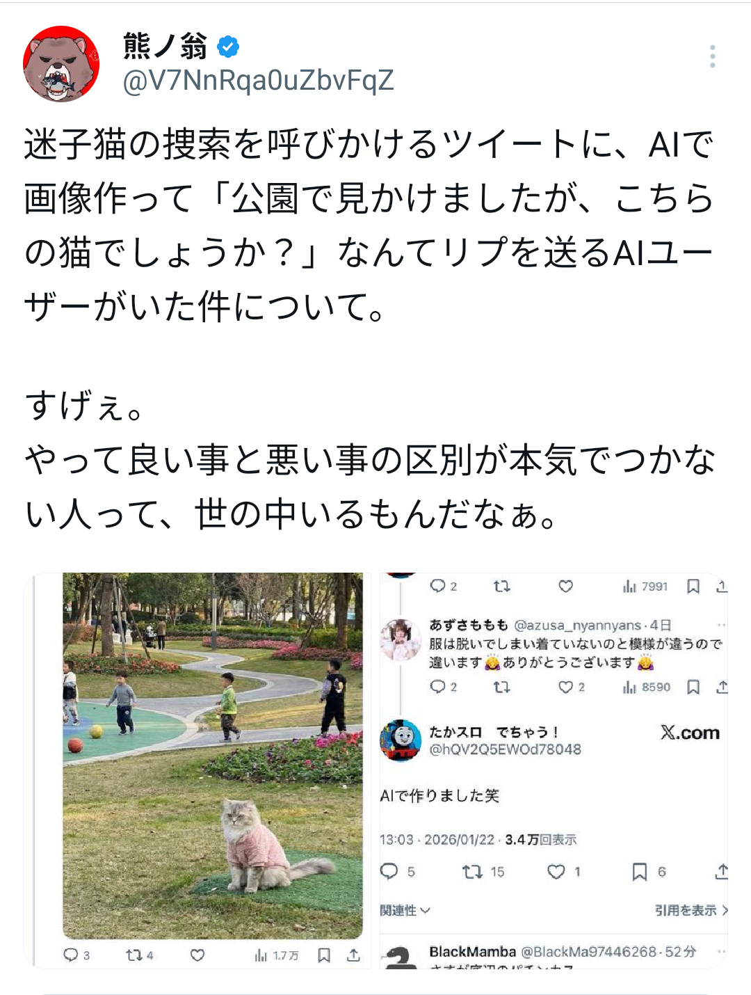 | … | 6026/01/28(水)08:46:36No.1396565238+元々猫探してる方も首輪つけて散歩させてたら逃がしたとかで何で猫を外に出すって叩かれまくっていたからこいつは騙して馬鹿にしていい奴だって思ったんだろう |