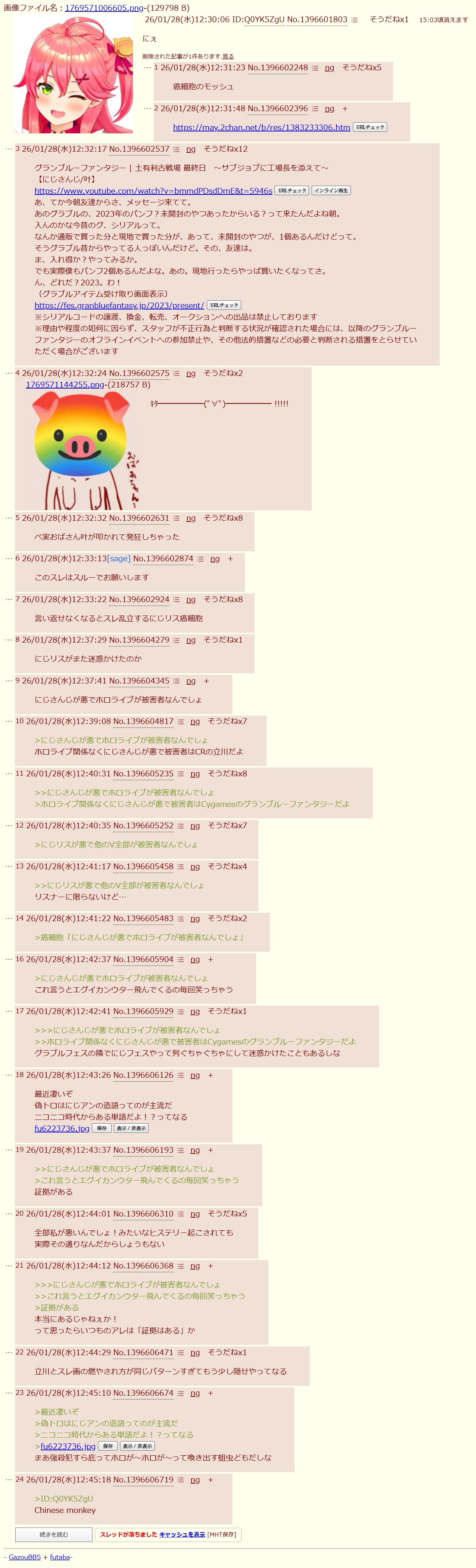 | … | 31226/01/28(水)12:30:22No.1396601898+>>(消されるにじさんじ卒業一覧) |