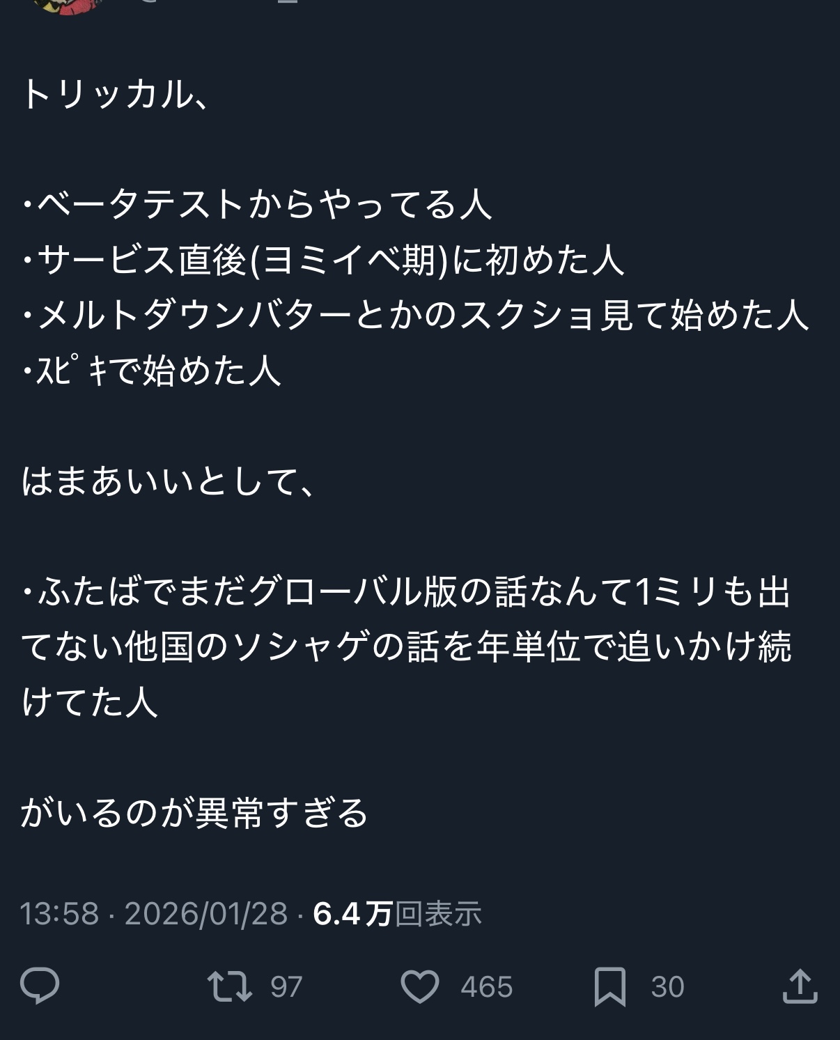 | … | 4426/01/28(水)17:13:09 ID:rcrGHuE2No.1396663633そうだねx7SNS上で○○界隈みたいなんとつるんでもろくな事無いにゃん |
