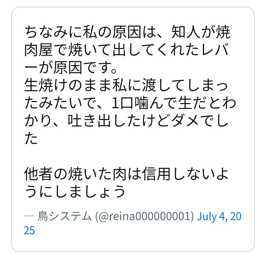 | … | 9626/01/28(水)18:09:44No.1396677533そうだねx2あと多いと言われる原因はカンピロバクターだから焼肉のトング云々より他な気もする…… |