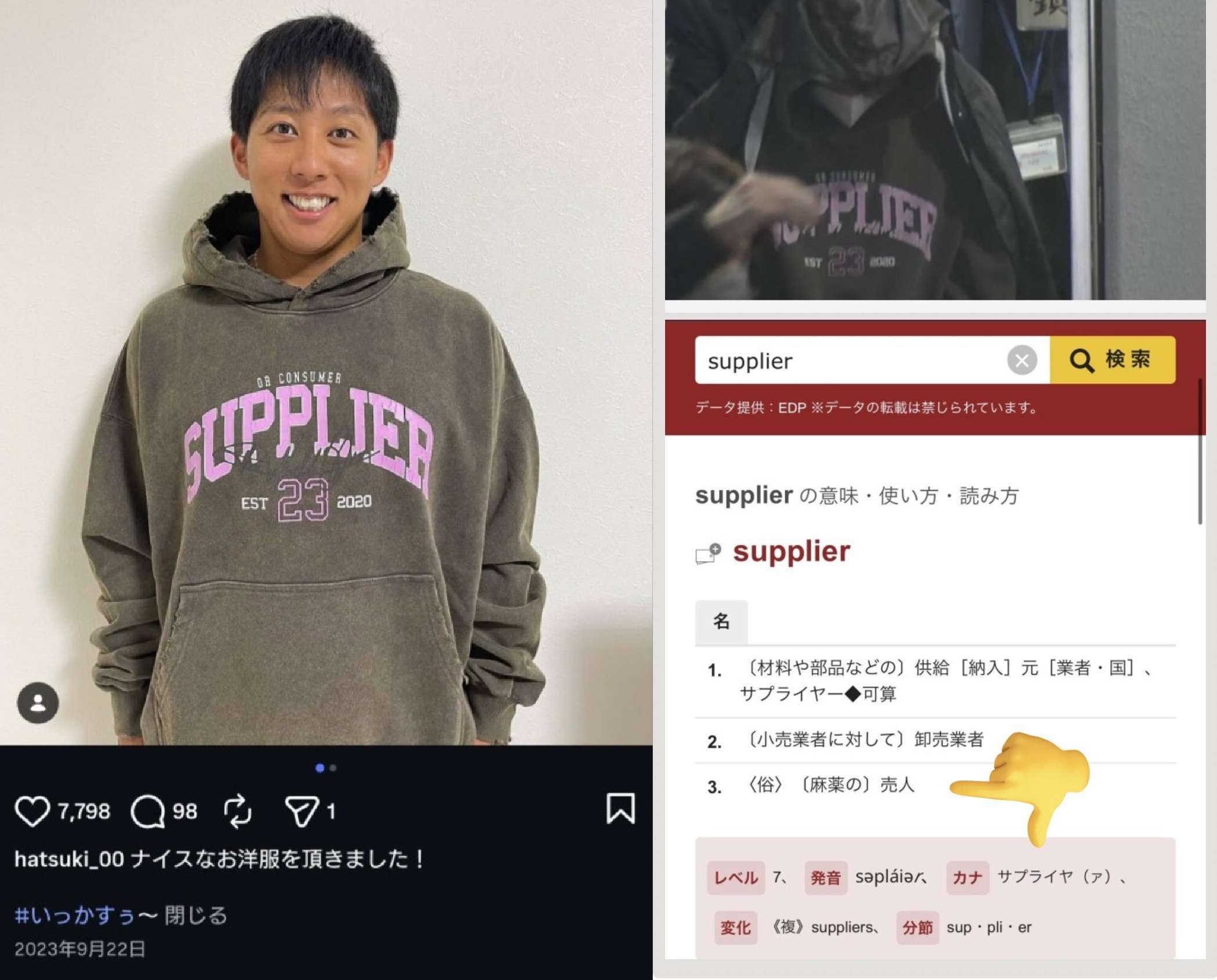 | … | 5426/01/29(木)07:45:17 ID:pjR88xqkNo.1396850231そうだねx1HTKが逮捕された時に売人って胸の所に書かれたパーカー着てるのは |