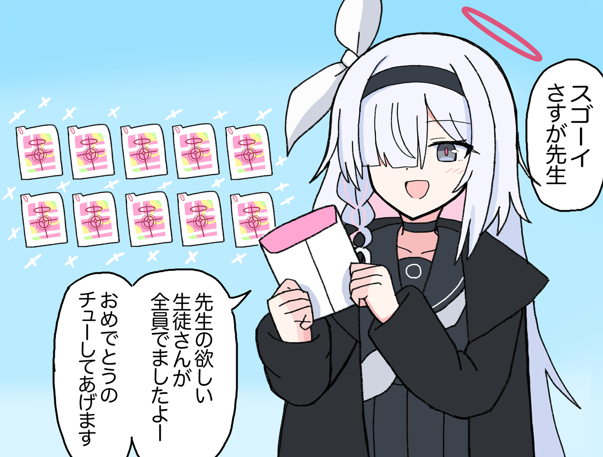 | … | 8326/01/29(木)09:48:43No.1396867311+今日ロクボで10連くれたしアロナがなんか感謝して10連くれるかもだし |