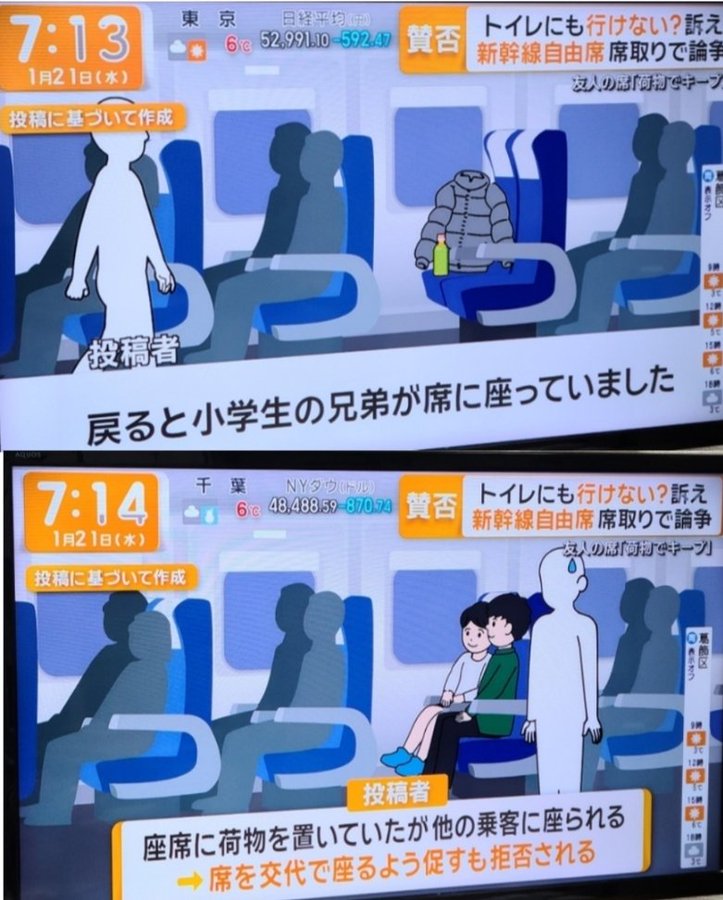 | … | 8926/01/29(木)08:27:25No.1396855356そうだねx1自由席は席の所有できないんだから当たり前じゃないの |